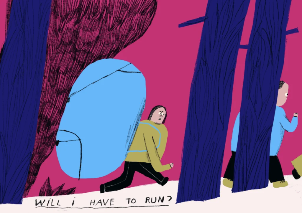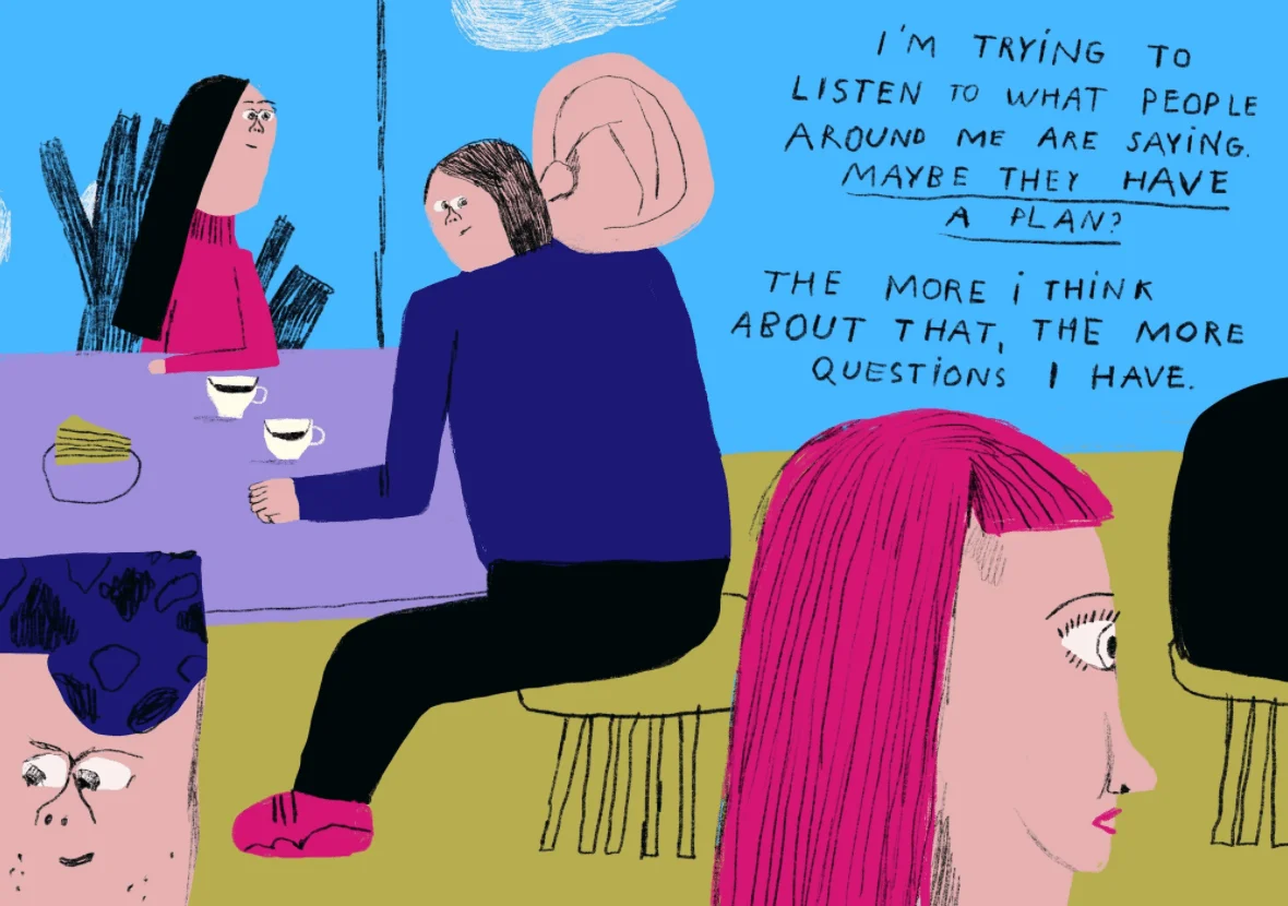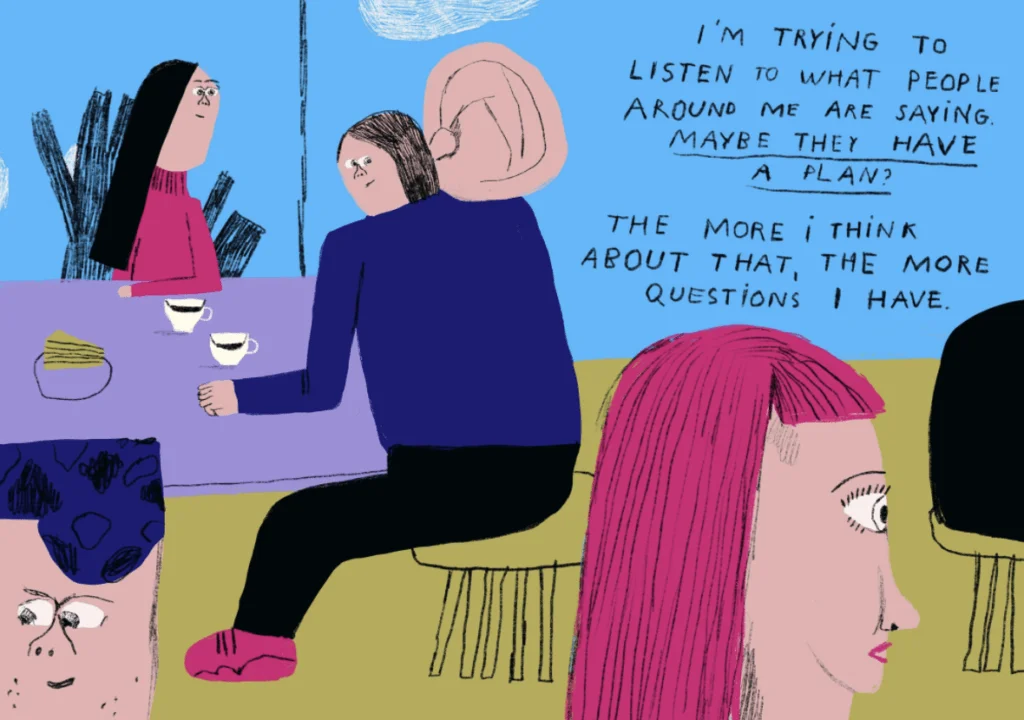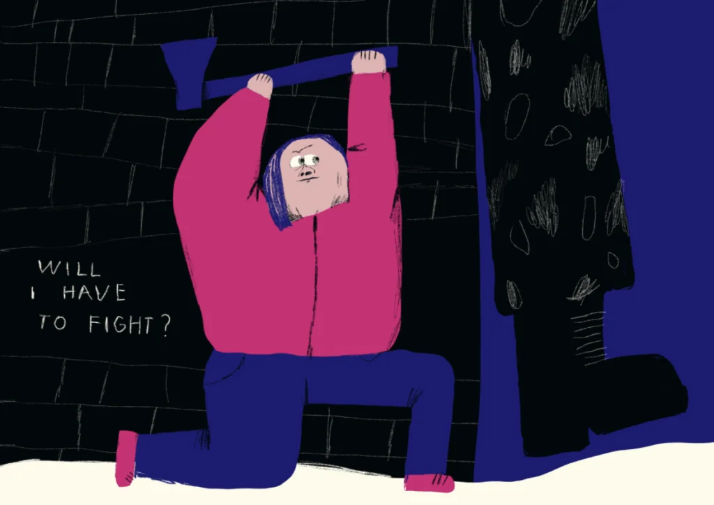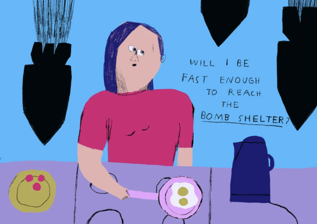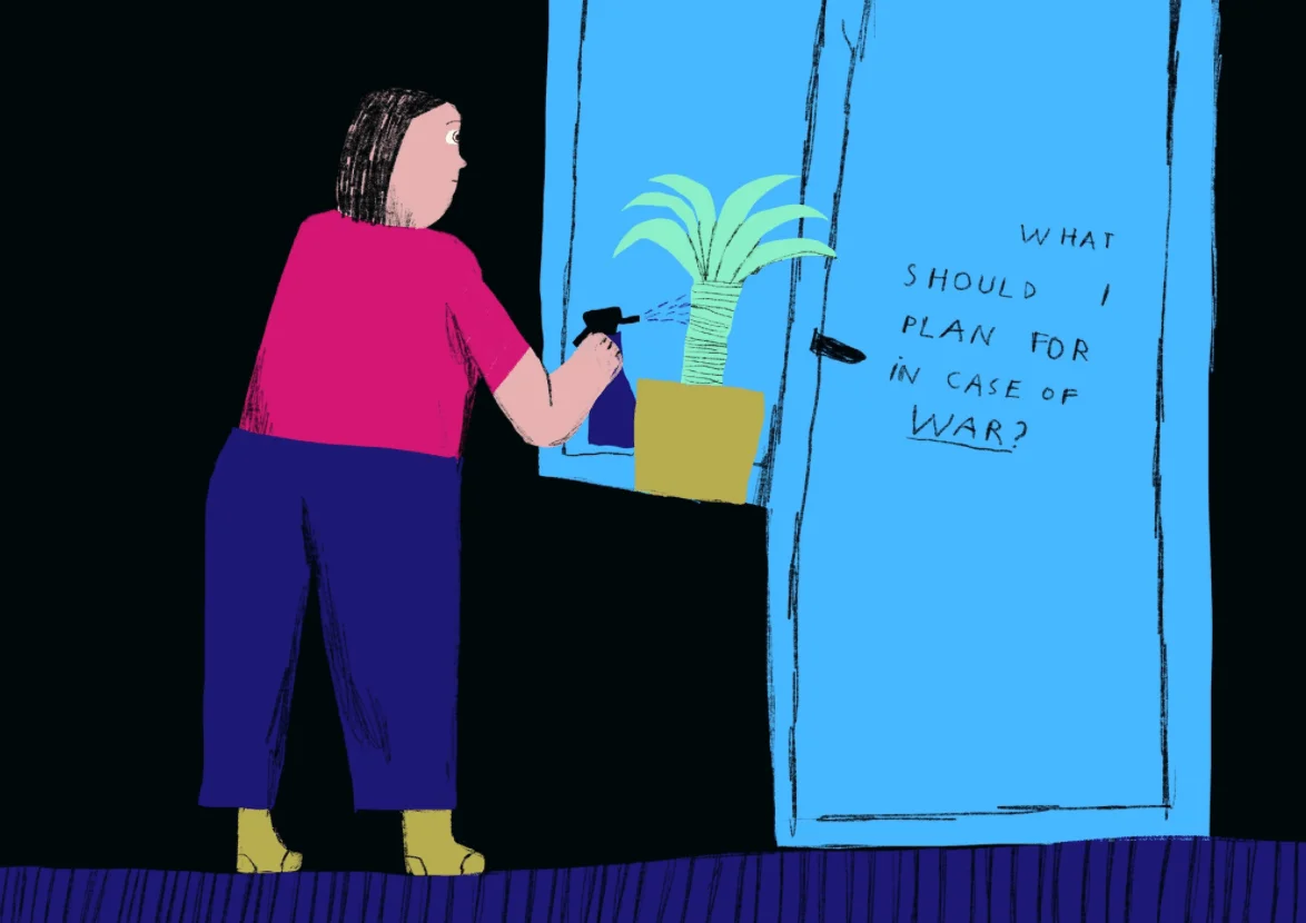 插畫故事中的主人翁,一個月前被同事問到「萬一發生戰爭該怎麼辦?」,她在忐忑不安中嘗試尋找求生方法,可是她最終只無奈地意識到:人們得以存活下來,全因運氣。