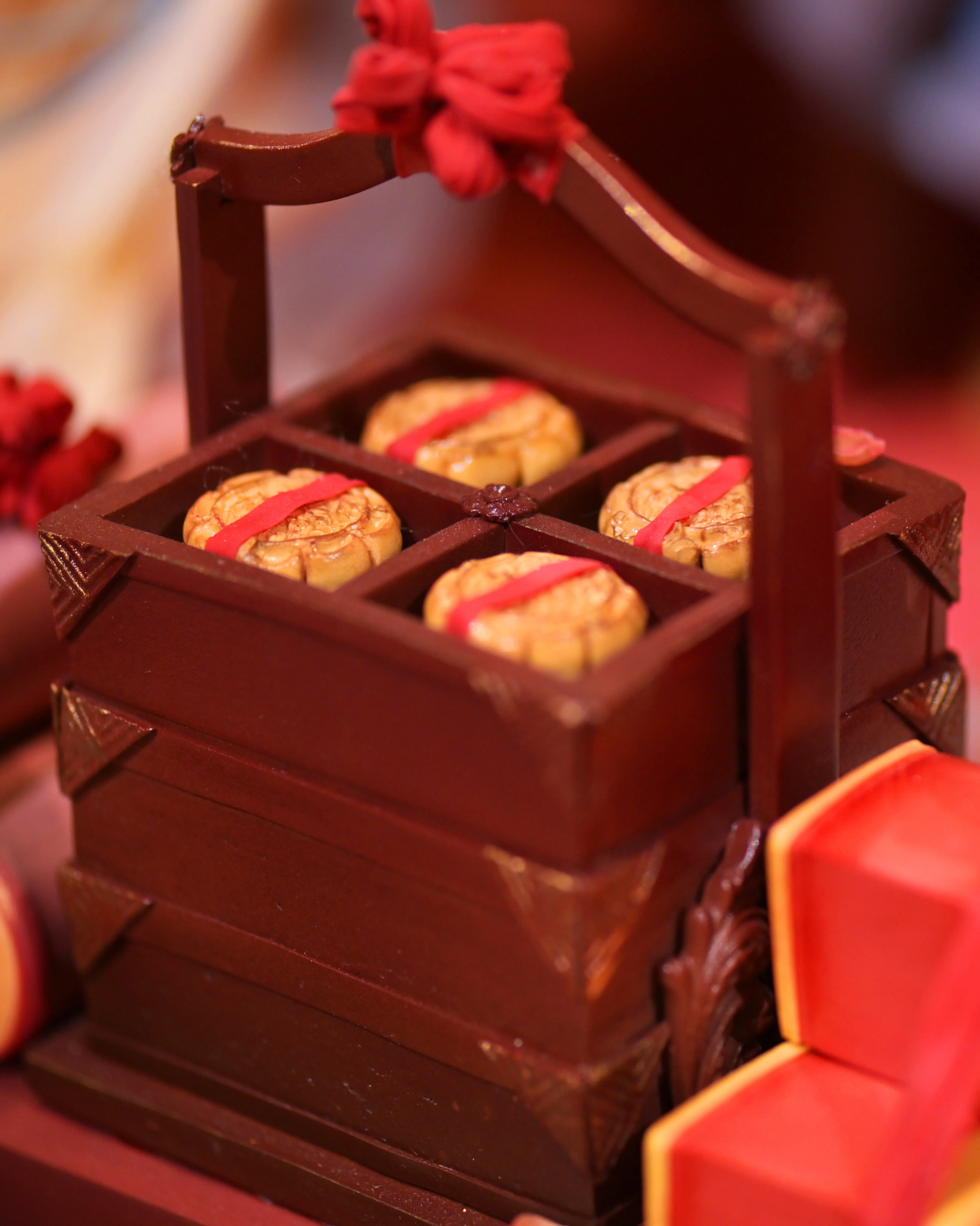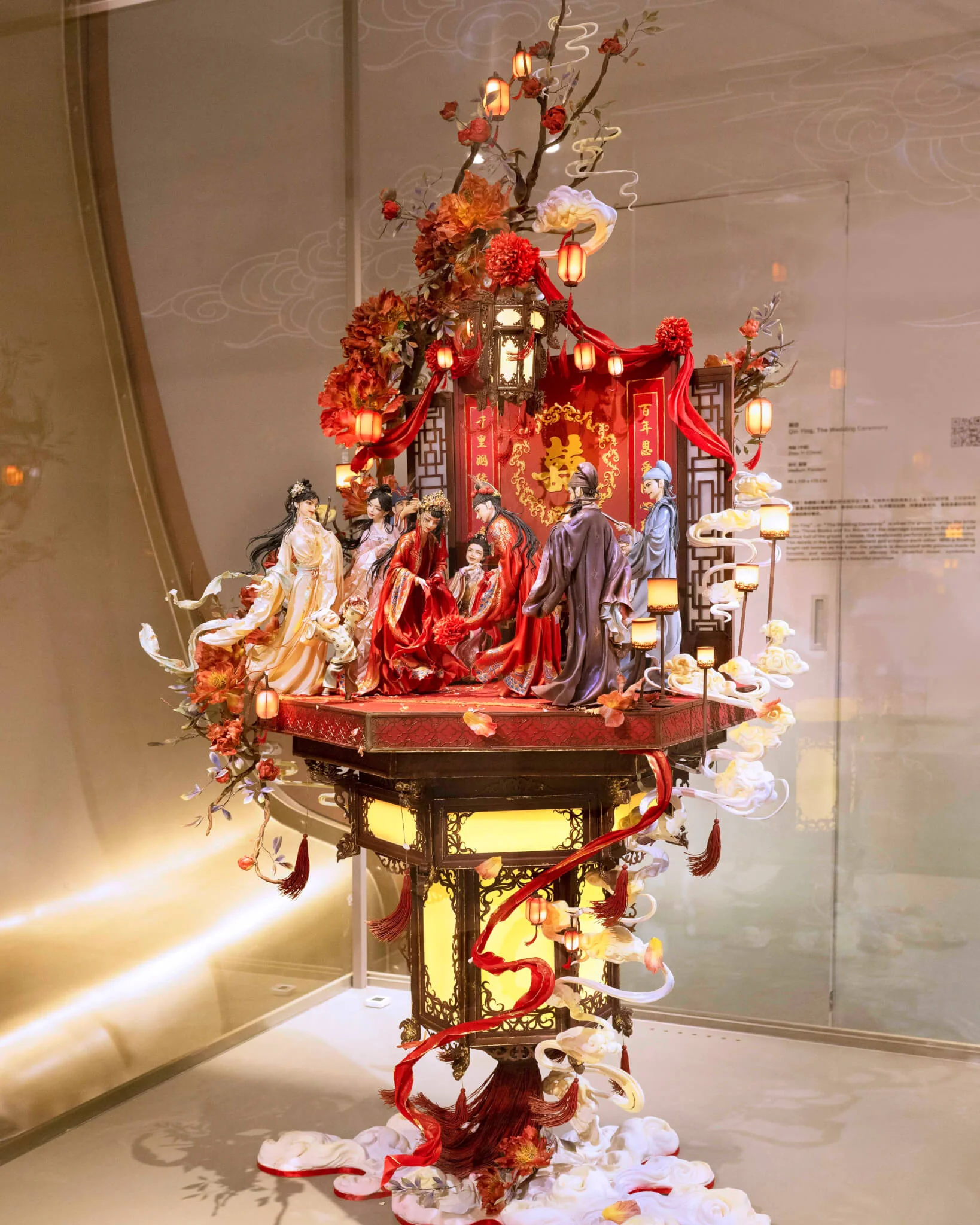 展品《親迎》與《納徵》是中國古代漢族婚姻習俗「三書六禮」的其中二禮,分別代表成親拜堂禮及過大禮。《親迎》借鑒中國榫卯工藝,以懸浮的大紅燈籠作為底座,一對新人正在行拜堂禮,新娘身穿「龍鳳裙褂」,表達喜慶的祝福。為突出《納徵》的氛圍感,周毅以翻糖彩繪及模擬花卉工藝,將盛開的玉蘭花由平面跨越到立體。