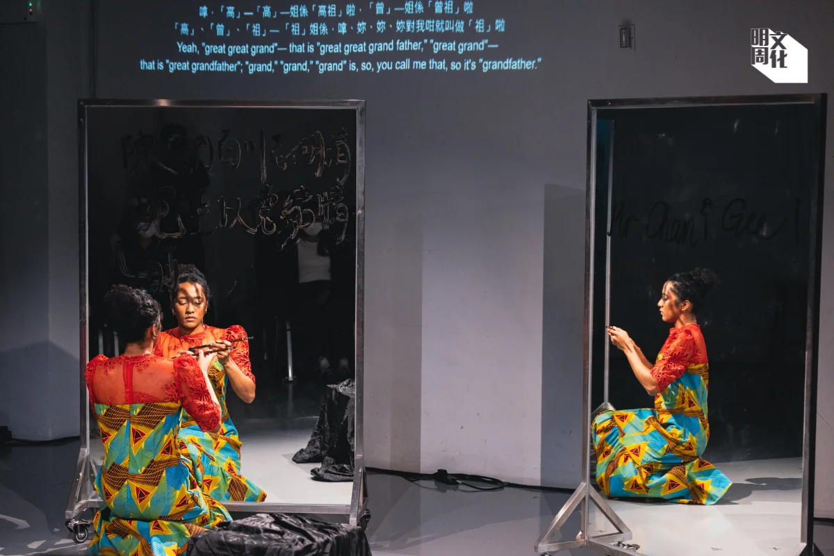 「寫這個創作的過程中,我認識媽媽多了。」她為演出而練習伊博語的諺語,而母親在她眼中,一直是擔起家庭的強悍女性,但講起自己的愛情故事,難得露出靦腆的一面。從香港飛到尼日利亞需時十幾二十小時,那時沒有電話,隻身嫁到一個從來沒去過的地方,尼日利亞的家人亦擔心她是否被賣到不知名的角落。母親在香港沒有家人,發生任何事上來,只有父親和父親的家人作為她第二個家。「她也經歷了很多才成為一個妻子,然後才會成為一個媽媽。」