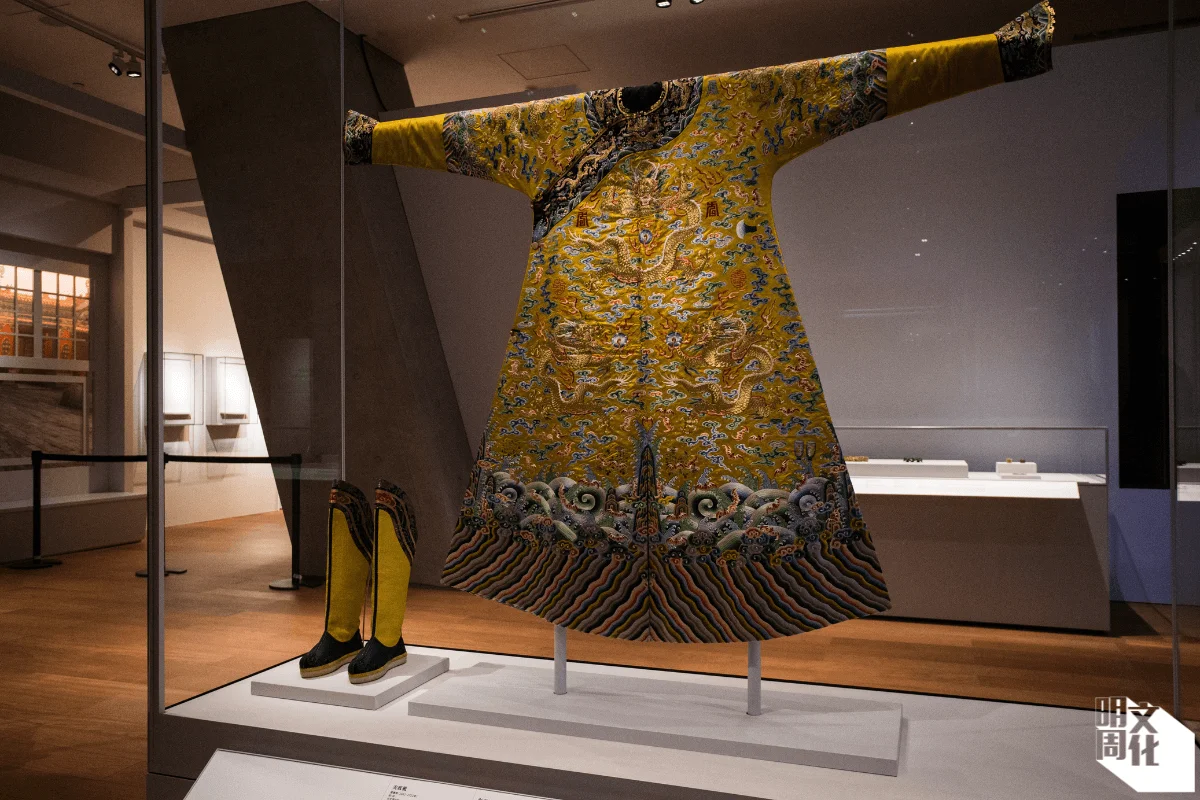 展廳一及二聚焦故宮,前者《紫禁萬象: 建築、典藏與文化傳承》位於地面一層,從不同角度介紹紫禁城歷史,既有大型文物如特磬與鎛鐘,也有精品文物,如盤龍紐「大清受命之寶」;後者《紫禁一日:清代宮廷生活》也是較大型的展廳,按時間為軸,由早到晚,大致綜合清代宮廷的生活流程,如早晨服飾穿戴,治理國事,御園戲曲等軼事,當眼處掛起彩雲蝠壽字金龍紋男龍袍,為古時節慶用之吉服袍,飾有九條五爪龍及十二章紋,以彰顯帝王身份。
