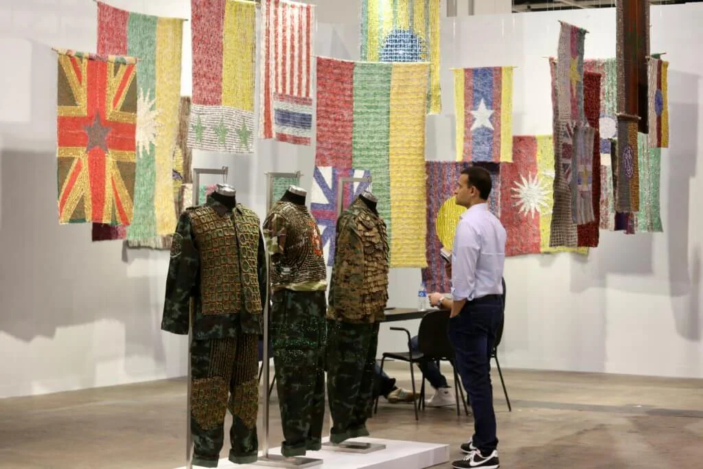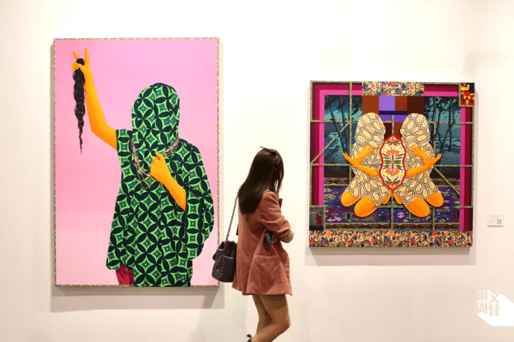 在官方策展以外,帶有明顯政治訴求的作品,散落於偌大展場一些角落。首次參展的Denny Gallery,策劃了伊朗裔美籍藝術家Amir H. Fallah的個人展覽,五幅畫作正正是表達出他對去年在家鄉爆發的頭巾運動的強烈關注與支持。Flowers Gallery則策劃了泰國藝術家Jakkai Siributr的個展,他用從緬甸若開邦收集而來的貝殼與珠子,繡在二十一面虛構旗幟上,組成名為The Outlaw’s Flag的裝置,希望喚起對羅興亞難民的關注,他們被緬甸政府迫害而逃往泰國等東南亞國家。