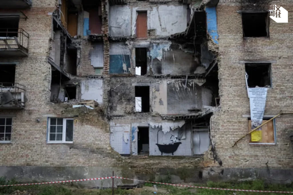 戴口罩的兩人從救護車取出紙板,貼到公寓內牆上,此牆本是民居一隅,俄軍轟炸後,整棟樓幾成廢墟。他們隨後拿起噴漆罐,開始創作。