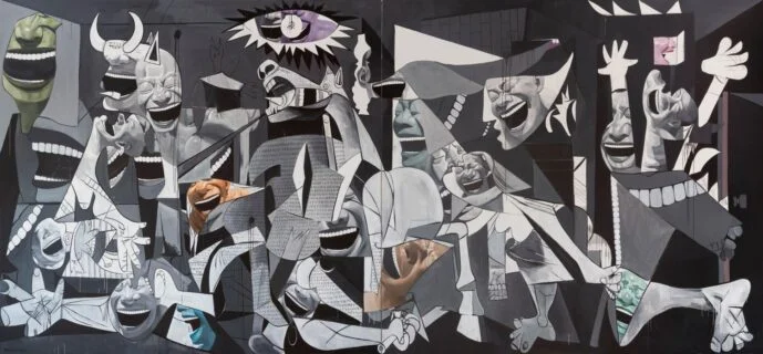 岳敏君,《Guernica: The Grin of War》,2022年。油彩畫布,300 x 740厘米︳當代唐人藝術中心