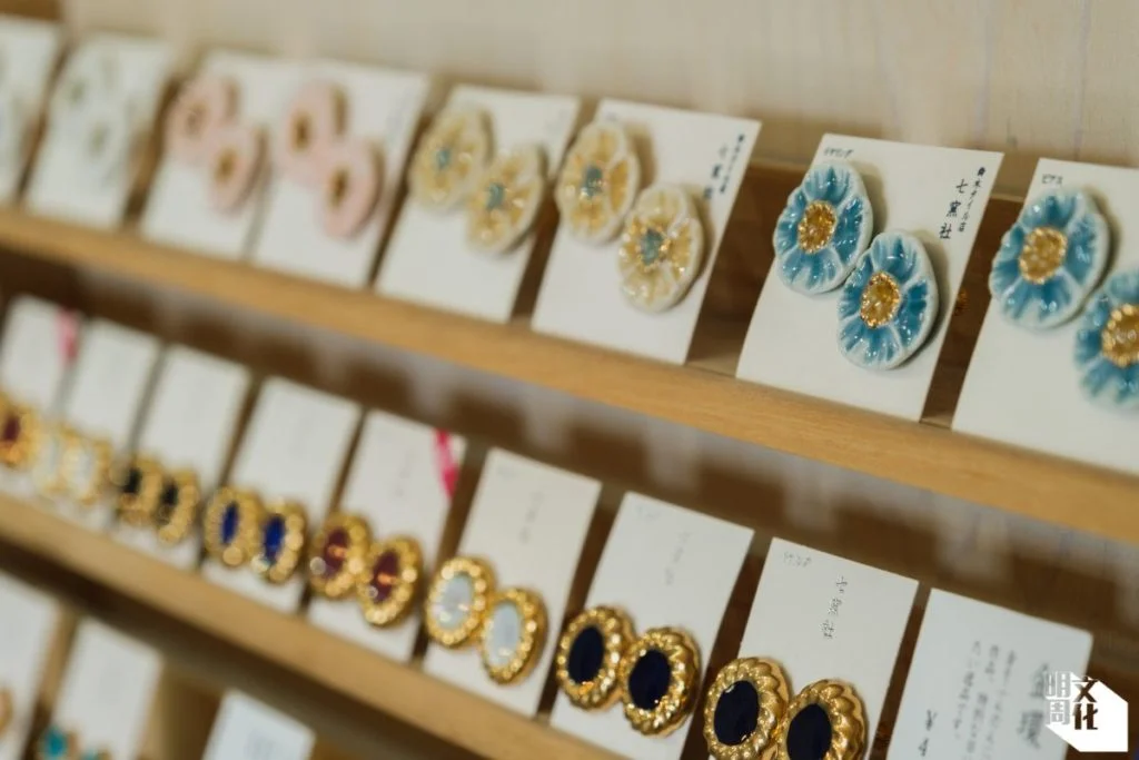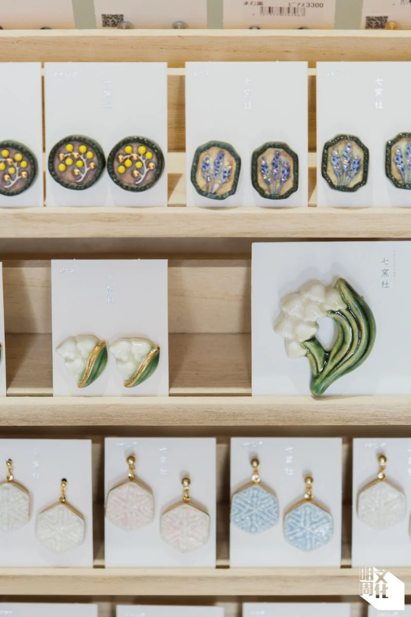 七窯社推出的陶瓷飾品種類豐富,賞心悅目:手繪藍花圓磚耳環,將傳統瓷磚的圖樣濃縮於小小的耳飾之中;櫻花耳飾裏,每一朵花瓣都纖細精緻;還有鈴蘭、鸚鵡、藍蝴蝶等多款胸針,工藝精細,造型鮮明……七窯社經常與當地的陶藝家合作設計,從公司瓷磚生產的歷史、當地四季風景中汲取靈感,將花卉、樹木、動物等元素融入飾品的形狀與色彩中。