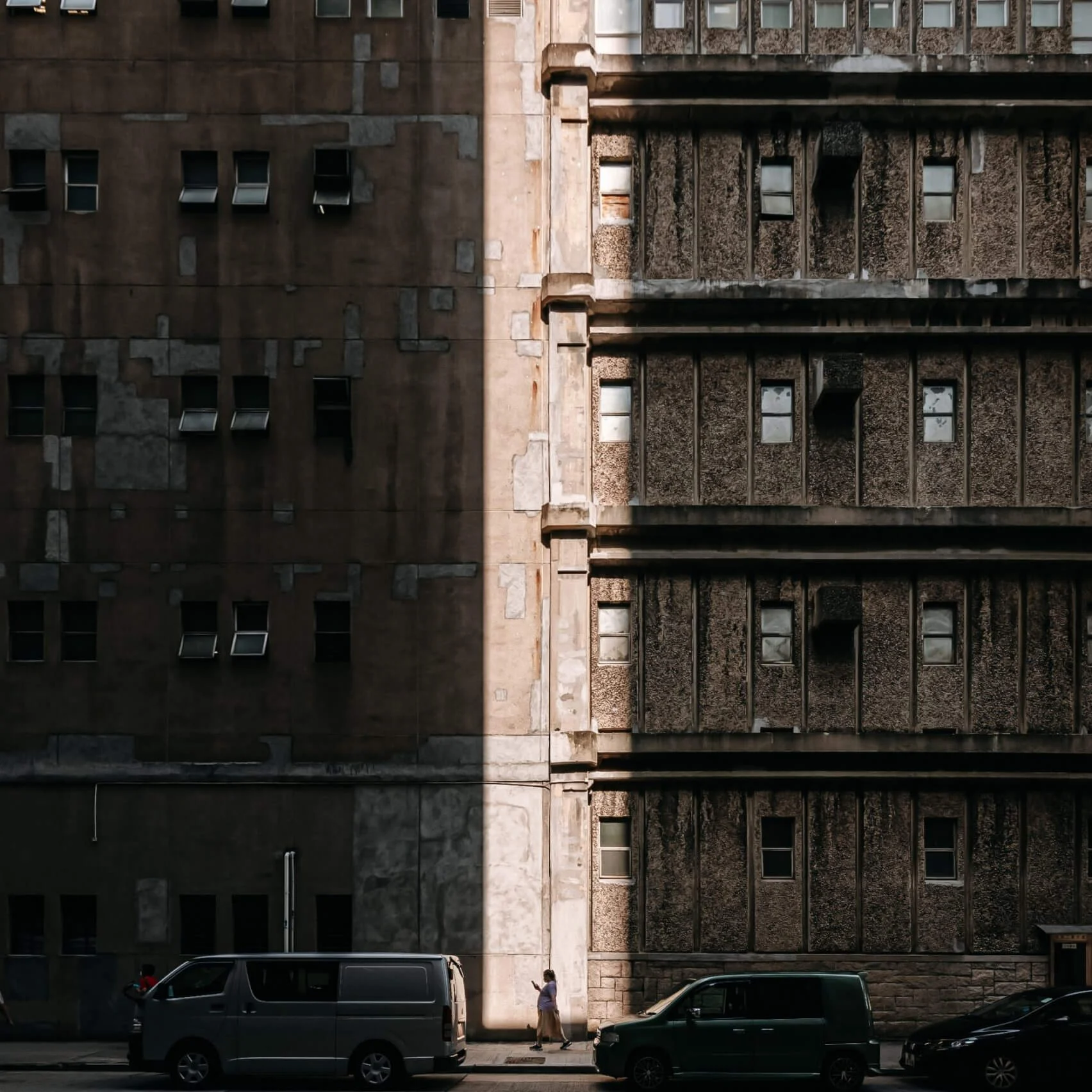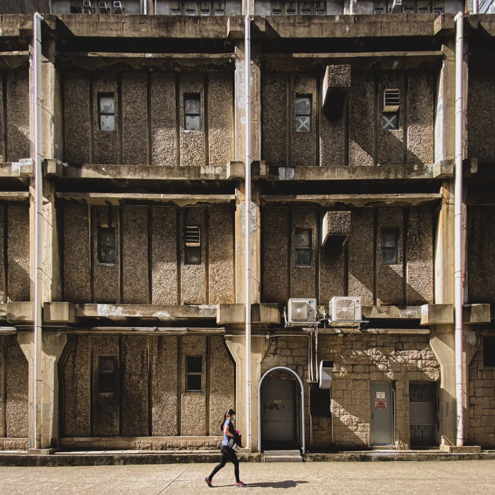 在密密麻麻的高樓大廈中找到一絲空隙,一道陽光傾灑下來,像舞台上的射燈,照在一座沉寂工廠大廈身上,瞬間點亮了生氣。路旁的攝影師Kevin看見剛好有行人經過,便果斷地按下快門,精準捕捉了充滿戲劇性一刻。Kevin是攝影師,也是建築師,他在拍攝一輯以香港粗獷建築為主角的攝影紀錄系列。粗獷主義建築Brutalism一詞看來威風凜凜,但其實它的現況正好相反,甚至乎還帶點委屈的感覺。