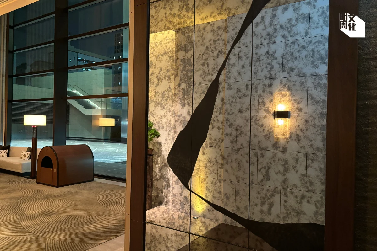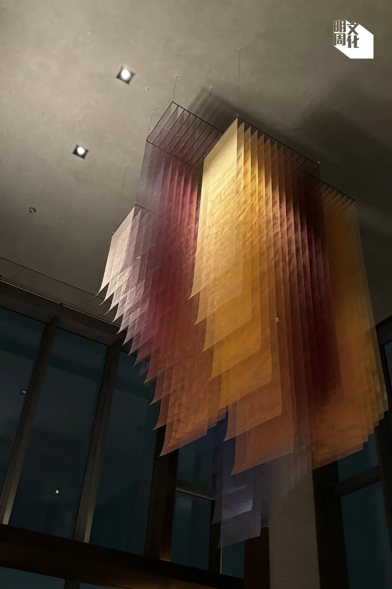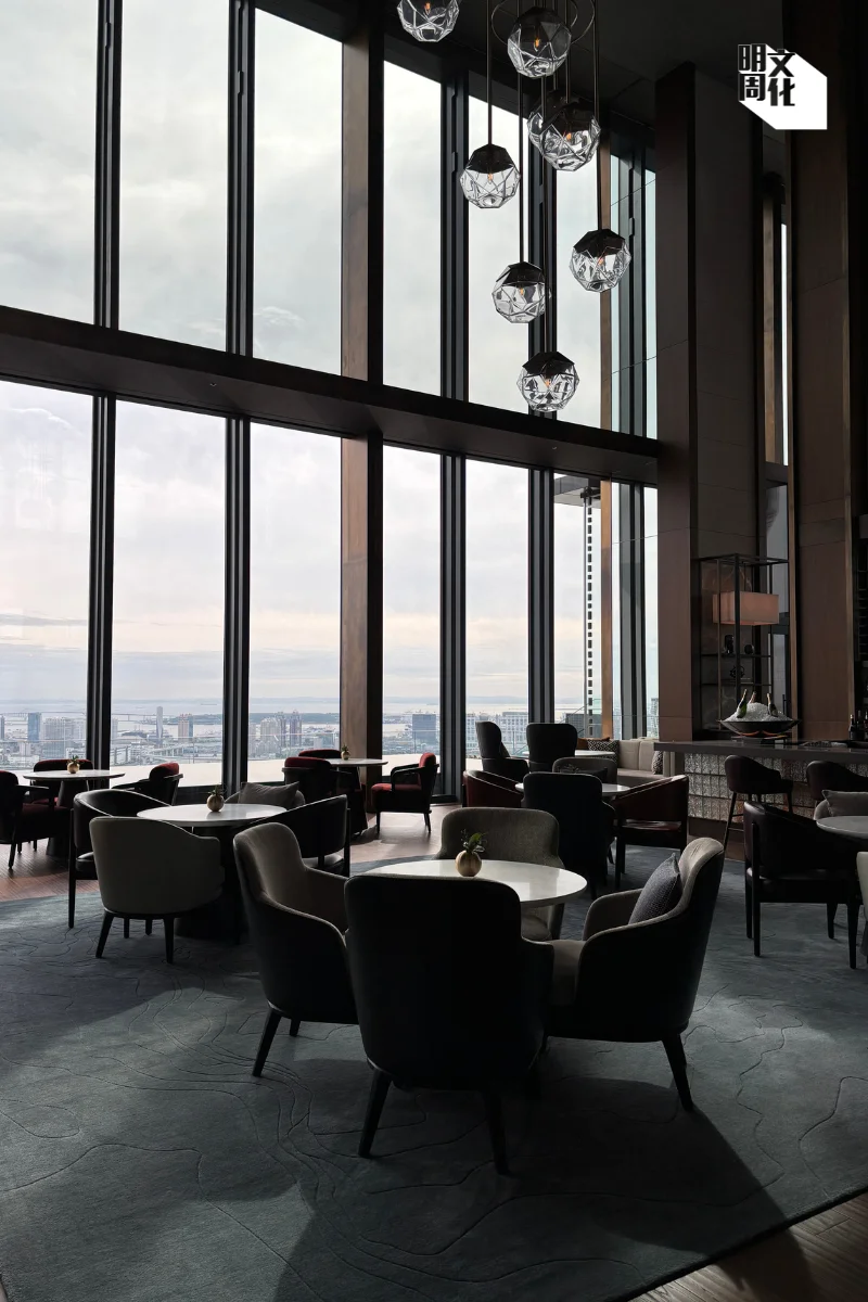 BAR Studio為酒店設計逾二百間客房、公共空間和餐廳,儘管人身處建築這「盒子」裏,視野又被帶到「盒子」之外。以第三十五層的空中大堂為例,大堂樓底甚高,Chirnside解釋大堂設雙層挑高落地窗,白天引入自然光,藉此嘗試將室內空間和室外開闊景色融為一體。他續表示,三十五樓大堂的吊燈由工作室設計和訂製,吊燈從天花傾瀉而下,卻不遮擋窗外景觀,同時吸引訪客目光向上。