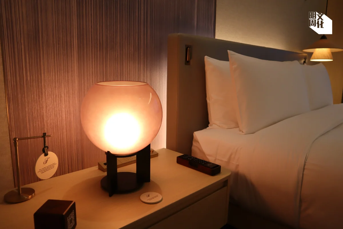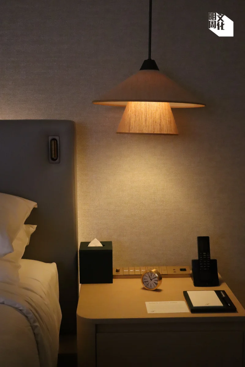 客房牆紙的印花紋理類似和紙質感,其圖案靈感來自日式傳統編織工藝。