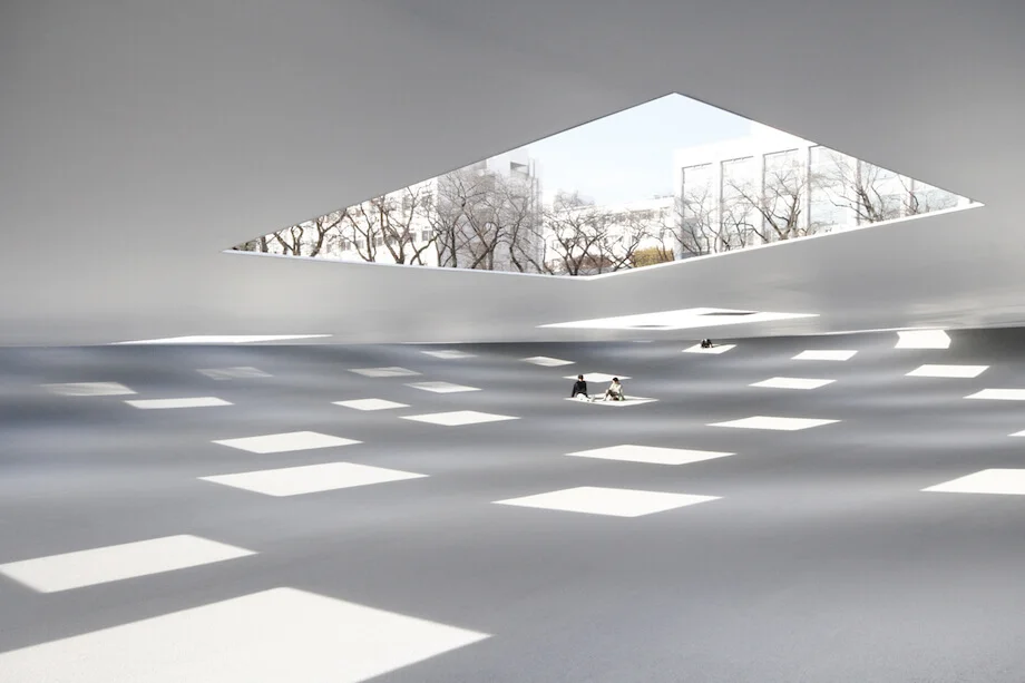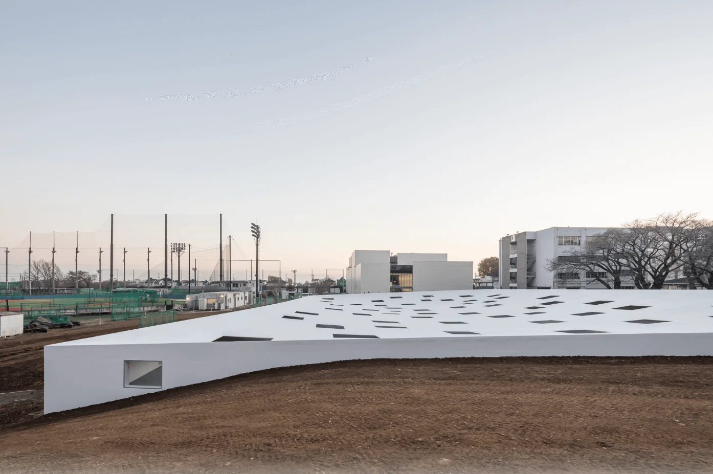 石上純也的建築在自然與人工、戶外與室內的關係的處理上,非常嚴謹,是次項目也不例外。他考慮到大學附近都是高中,欠缺景觀多樣性,於是在天花板開了五十九個方形的孔,大方讓日光和雨水跑進廣場內。在如山坡般微鈄的地面,人們在晴天時可躺着看天空,下雨時則身處一束束水柱之間,感受大自然的變化。在他眼中,建築物不是用鋼筋水泥,把大自然隔絕在外,而是與之共存,把外面的風景引入到建築物之中。