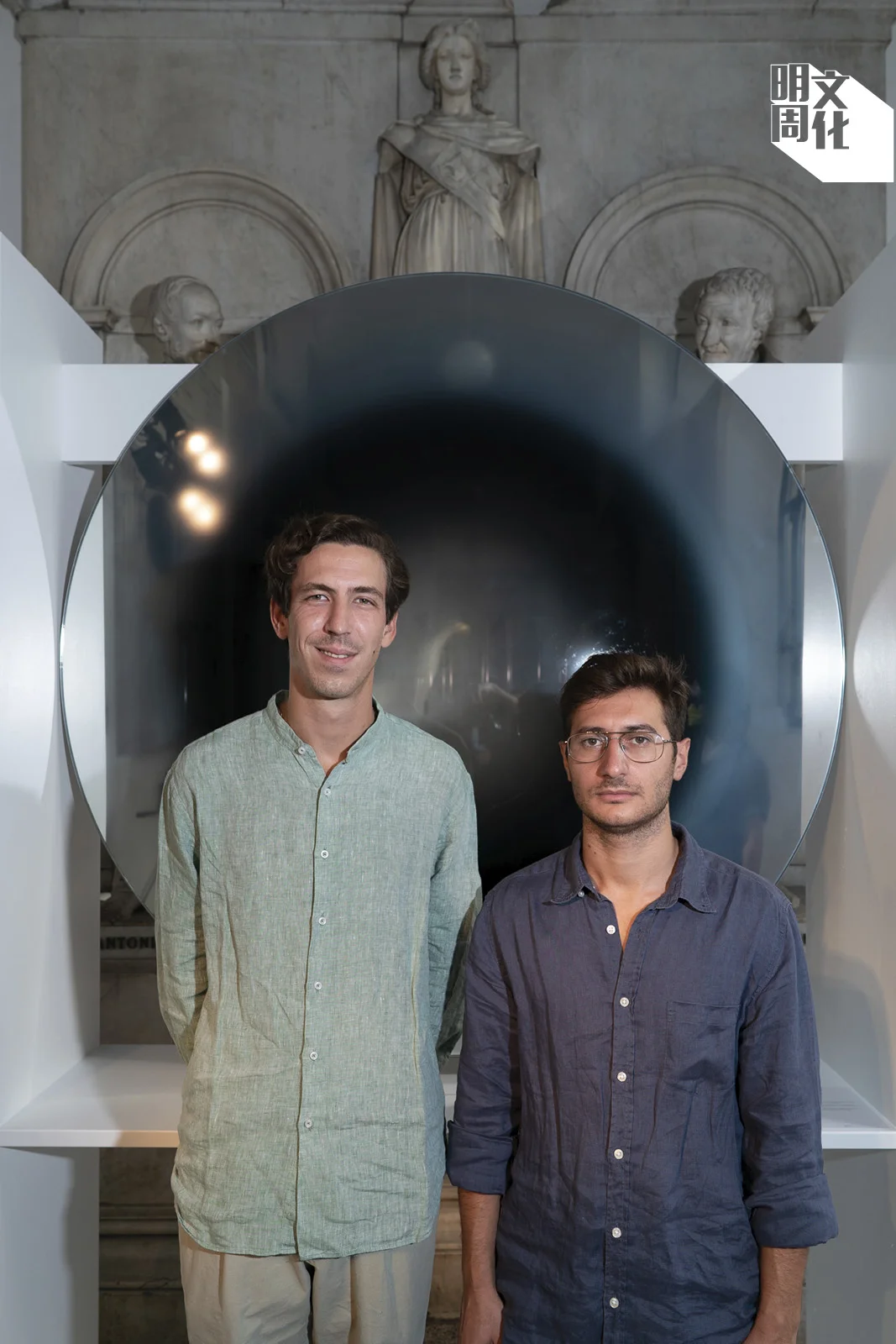 Costantino Gucci與Edward Raneri也來自意大利,負笈到倫敦聖馬丁攻讀Industrial Design也好幾個年頭,結果在疫情期間,也回到意大利來。在這次復又舉行的米蘭設計周,他們的作品《Inevitable future》參與了其中一個場外展覽5Vie。今年的米蘭設計周與過去一樣,有一個主要展覽場地,加上散落米蘭四周的其他場地。不同的是今年比較大型的裝置減少,取而代之的許多介乎藝術裝置與家具的小型作品。《Inevitable future》就是其中一件作品。這直徑逾兩米的裝置如一顆巨大的眼球,外圍是鏡面,內圓卻是暗綠色的如瞳孔般,而在最核心的部分,就能隱隱看透,觀看到裝置背後的事物。