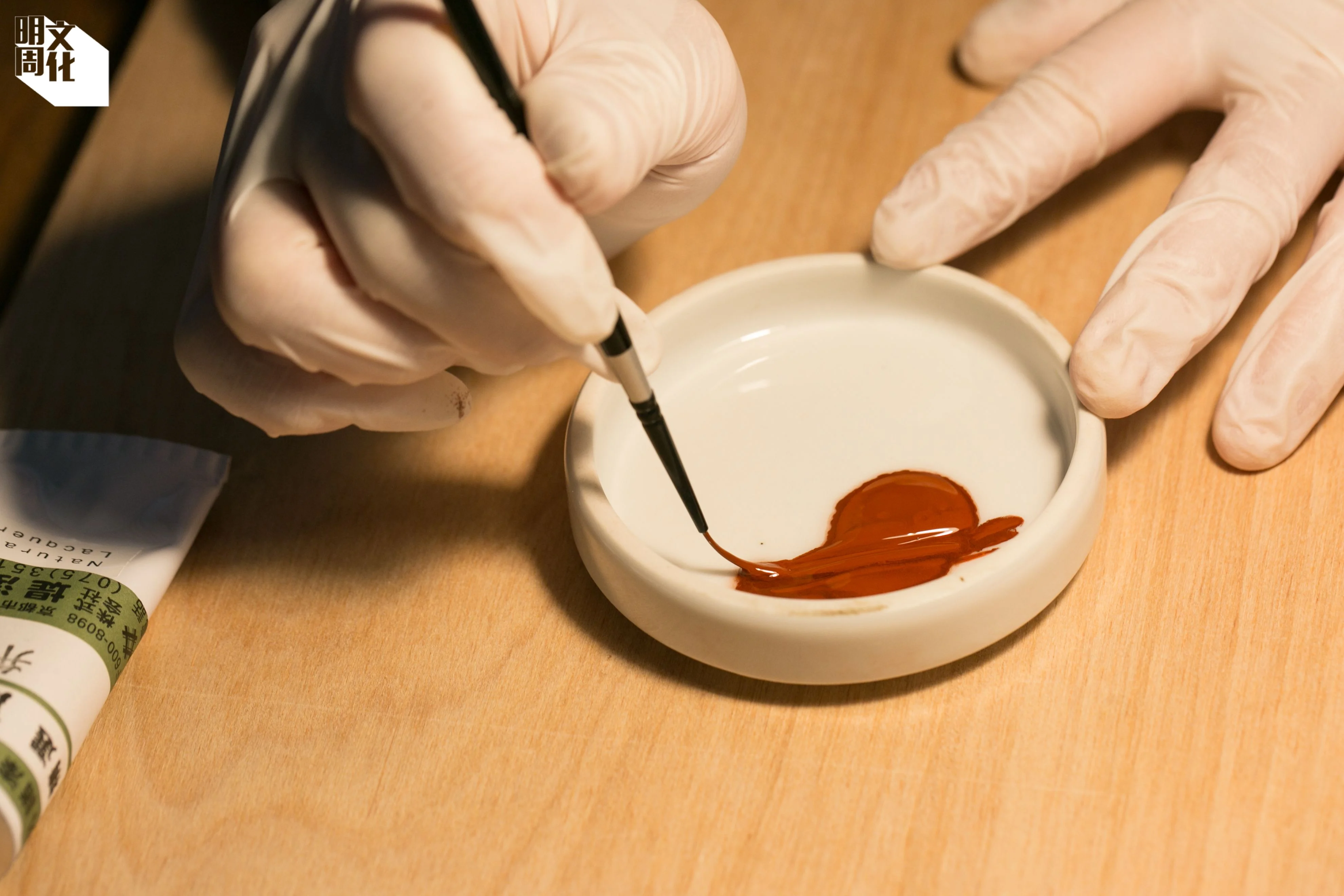 而他倆絕不滿足於「仿金繼」,屢向師傅請教真正的金繼傳統工藝,但對方三番四次拒絕,因為怕生漆引致皮膚敏感。「因為漆的敏感可以很誇張,Matthew試過兩、三個月,手部都不能行動自如。」Eugenia補充,Matthew屬偏激體質,對漆有如此程度敏感反應的為少數。最終,可料到,Eugenia和Matthew成功打動師傅,兩人跟他斷斷續續學了一年,其後再自己讀書深究,持續修練。