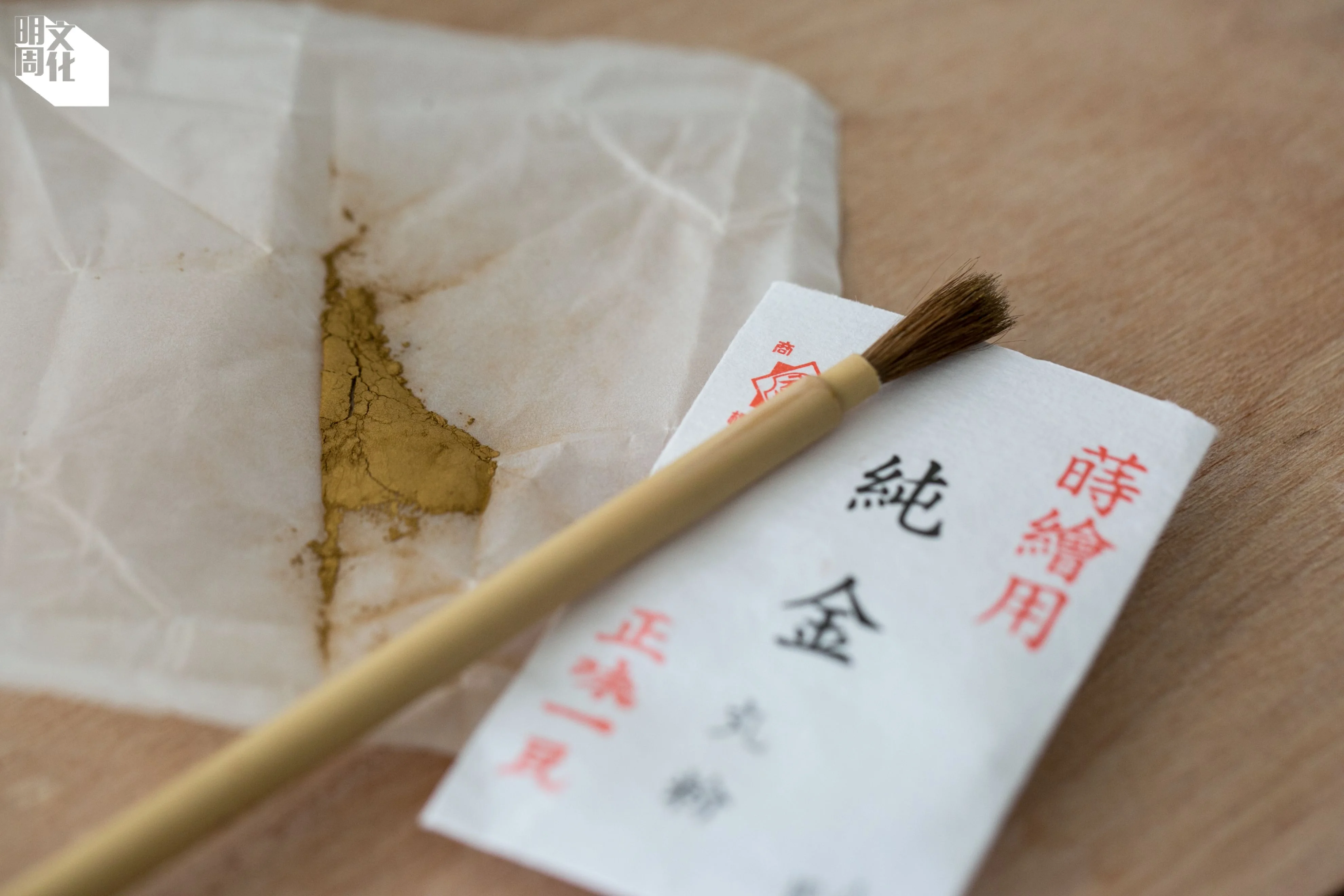 4 灑上金粉:繪漆半乾時,灑上金粉,再上一層透明保護漆,稍稍打磨,完成。