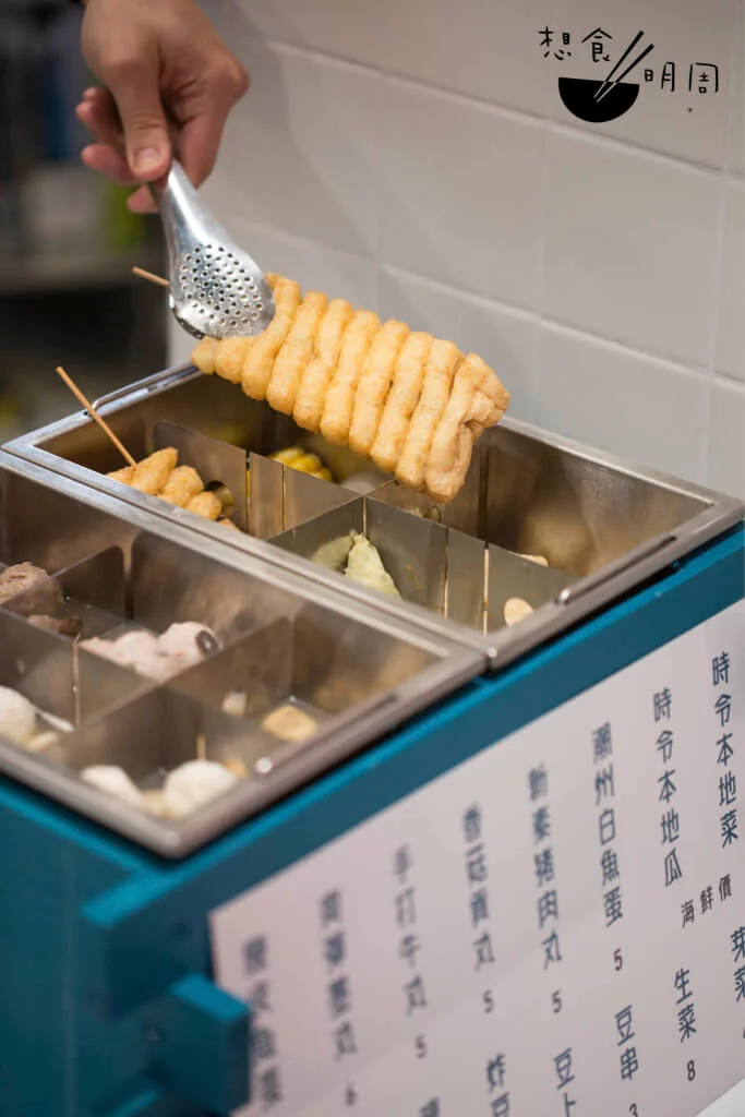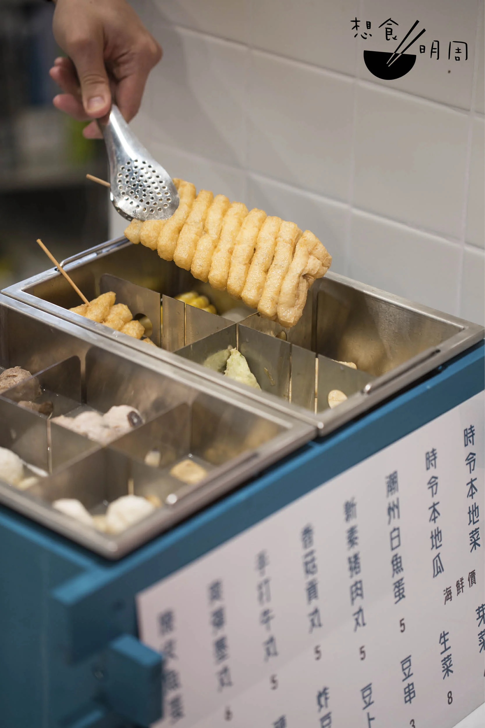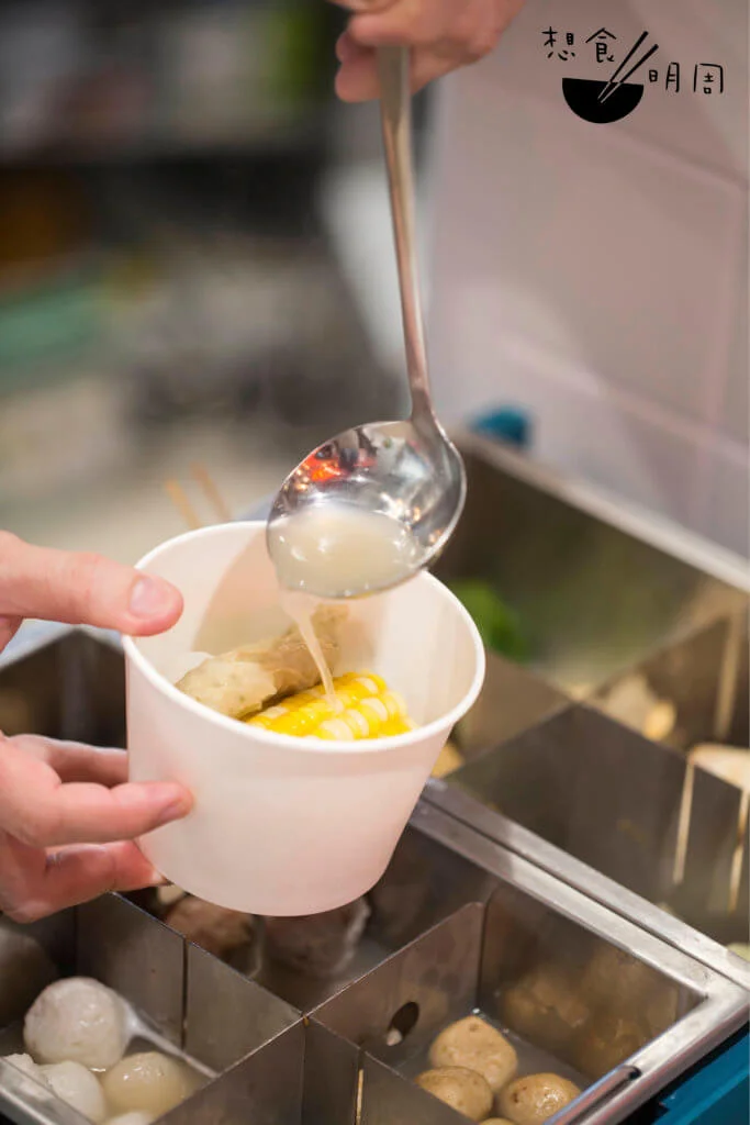 「那是香港版的關東煮」,店主羅庭輝這樣形容。日本有關東煮,在昆布或鰹魚湯內煮製雞蛋、蔬食、豆品、蒟蒻⋯⋯如若換成香港版,可行嗎?羅庭輝與廚師一於嘗試,用花膠豬骨淮山湯作為湯底,以香港製造的魚蛋、牛丸、豆品、蔬果為配料,同樣是一串一件,每件$5起,任來客隨意點選,逐件計數。形式與關東煮極盡相似,內膽卻是改頭換面的香港滋味。捧在手心同樣會暖笠笠,一口一口卻是更貼地而窩心的「香港味」!