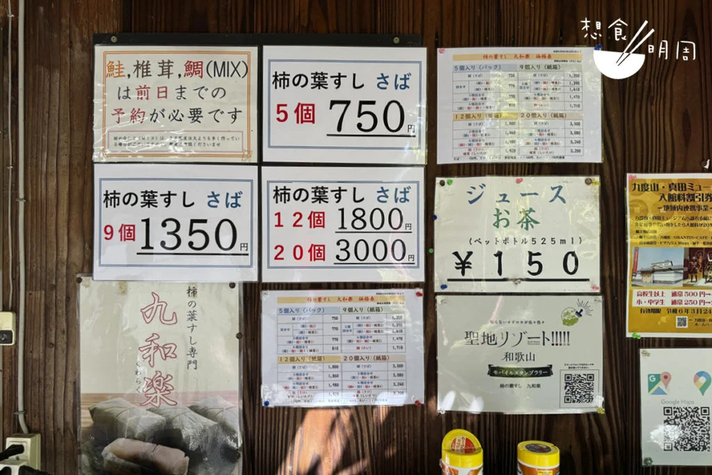 開在高野山附近的九和樂,是山野間有名的「可攜帶壽司」店舖。老闆岡昭弘先生介紹道:「六月至十月使用新鮮葉子,而其餘時間則使用鹽漬葉子。」前者特別芳香,後者則旨味重。每天他都會跟母親、員工,以手作形式包製所有柿葉壽司。「選油脂豐富的冬鯖魚,配我們獨創的甜醋,味道剛剛好;而米飯就混合兩款米種,即使放涼了,味道依然不變。」他們會先攤開柿葉,於具光澤的葉面中,按次序放入鯖魚片、米飯,接着如包禮物般,摺成可愛的長方形,放入如箱押壽司的木盒中。「這是為柿葉壽司特製的木盒。」尺吋剛剛好,闔上木蓋,就可以為柿葉壽司定型。