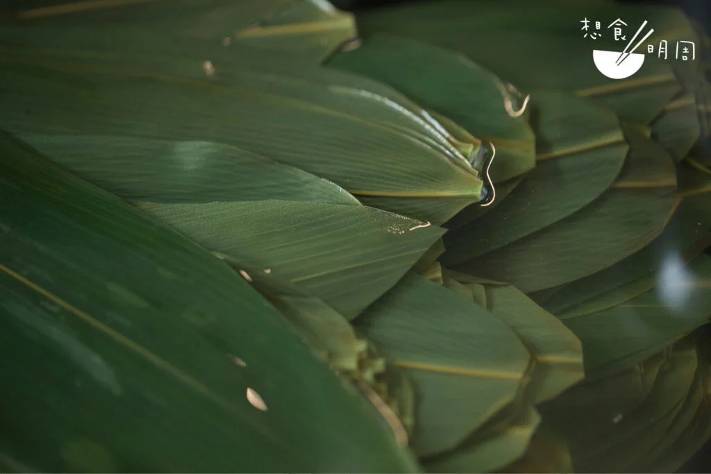 用乾竹葉包糭前,必須逐片洗擦以淨去灰塵,並且預先烚煮使其軟身。今年用新鮮竹葉,只須打開真空袋,略為浸洗即可,乾淨簡單又省時。加上鮮葉韌力強,捲覆時不似乾葉易爛、易漏米,包起糉時也更易上手。回想起,舊時人們製糉都是就地取材,從「以竹简貯米」,至後來取各種植物長葉包糉⋯⋯如今看來,現代運輸發達加上包装術之利,興許可讓大家無須「就地」都能重拾鮮葉風味。