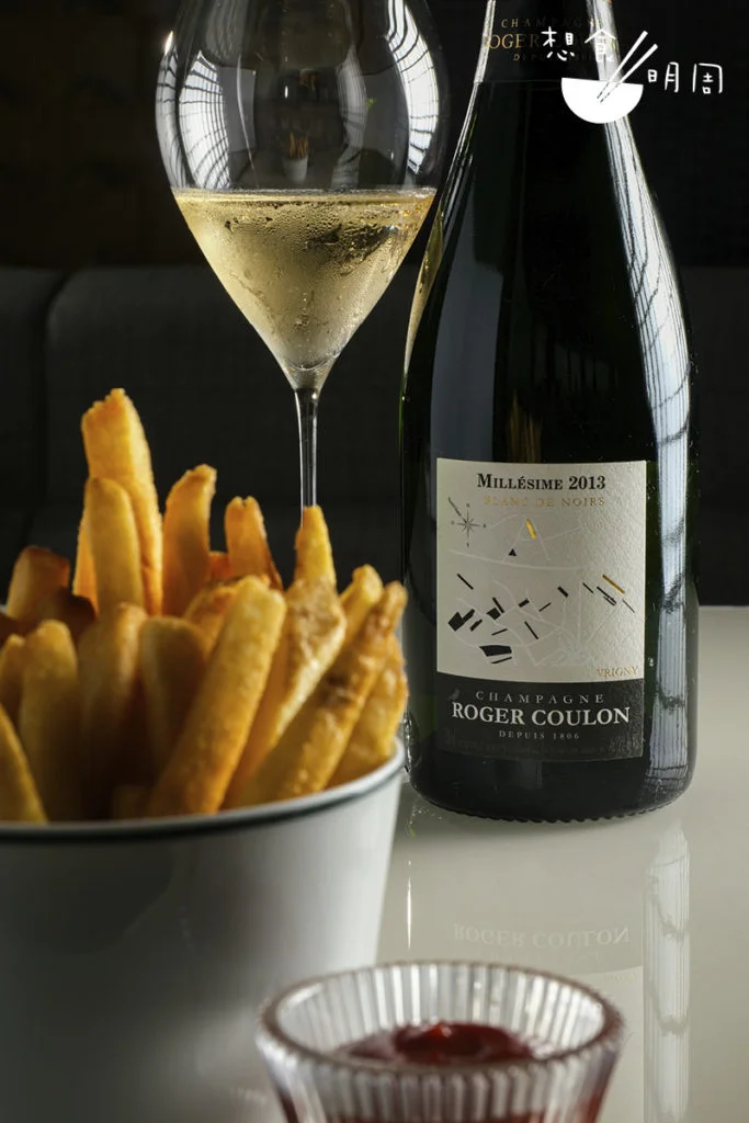 小農香檳與餐點的搭配守則,又會如何呢?Rex推介High-Low Food & Wine Pairing。「就像法國Roger Coulon的Blanc de Noirs Extra Brut 2013,清一色用深色葡萄──一半 Pinot Noir、一半Pinot Meunier;再花五年陳釀,只加三克糖。那高酸度的酒體,與薯條的油脂、甘香很搭調。」複雜的香檳配簡單的料理,竟有着意想不到的和諧。
