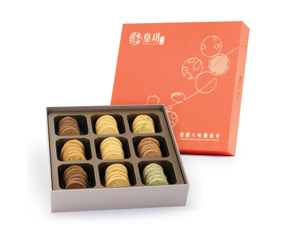 新年禮盒包括豐盛皇至尊新年禮盒、皇至尊新年禮盒、新年特級精選禮盒、新年金裝精選禮盒、新年品味精選禮盒、新年經典精選禮盒,提供不同的口味及搭配組合。新年禮盒還有精選組合—精選八味脆曲奇禮盒及精選八味蝴蝶酥禮盒,一次可以試齊8款口味的曲奇或蝴蝶酥,滿足想嘗試多款口味的願望。