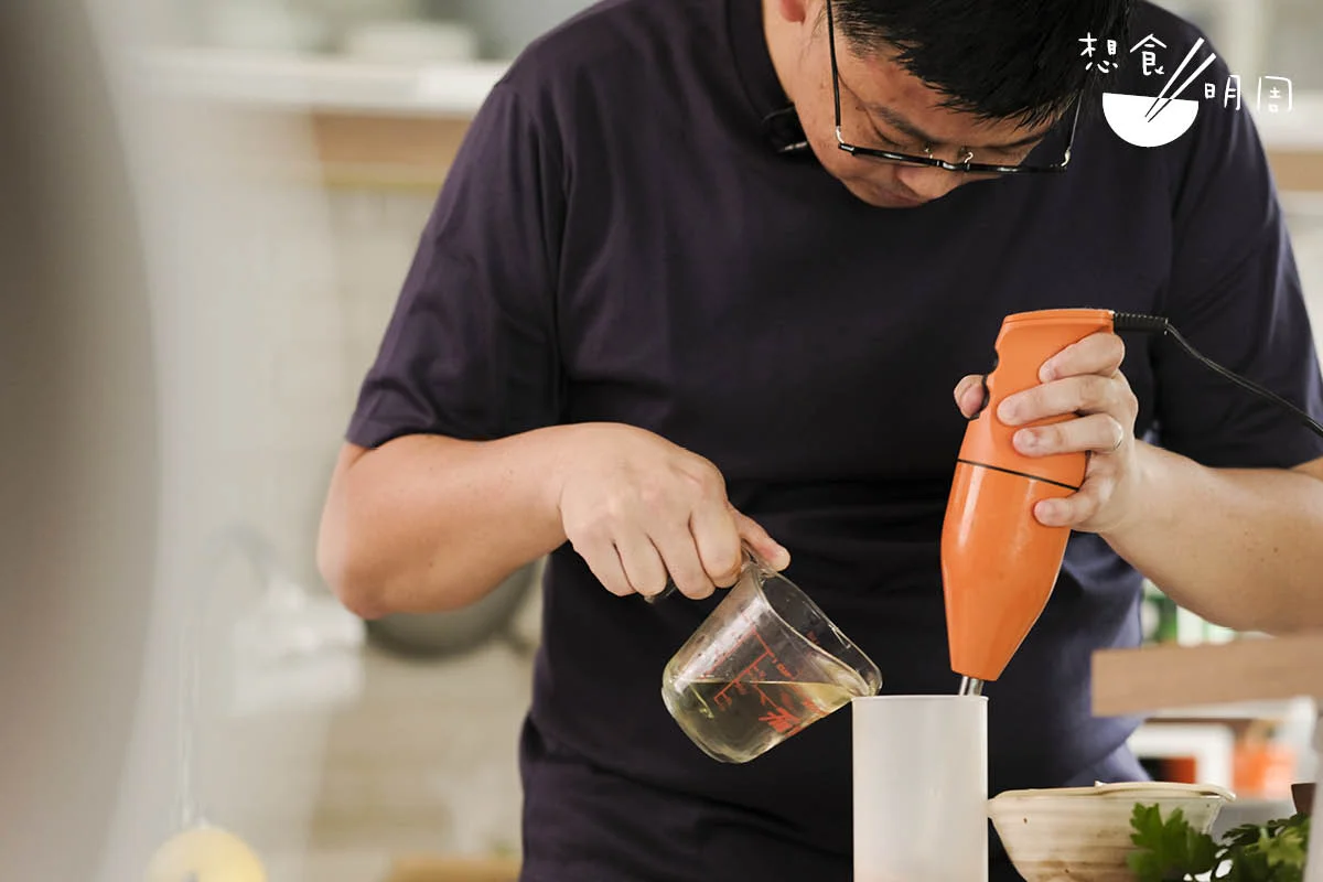 2. 用打蛋器,慢慢將菜油拌入已拌勻的蛋黃。開始時宜逐少加入,邊倒邊用打蛋器拌勻,直至蛋黃醬開始變濃稠。