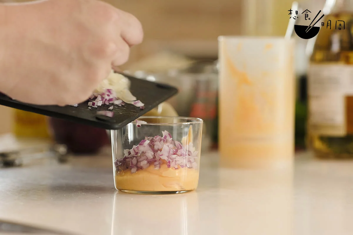 5. 製作蕎頭他他醬。蕎頭及洋蔥切成細粒。
