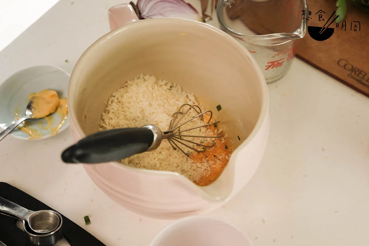 7. 製作蟹餅。將蟹餅所有材料(除了蟹肉)放入大碗拌勻。