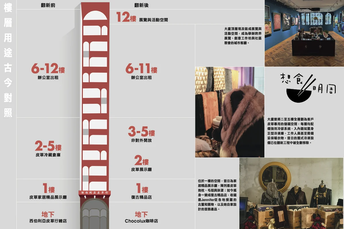 它的前身西伯利亞皮草行,承載數十載風華歷史,在那個冬日依然刺骨的年代,曾是無數人心中的「頂級溫暖牌」。今天,冬日已漸暖,皮草市場盛況不再,這座建築卻未曾褪色,正以現代創意概念翻新和轉型,試圖改用朱古力打造充滿溫度的藝文空間。