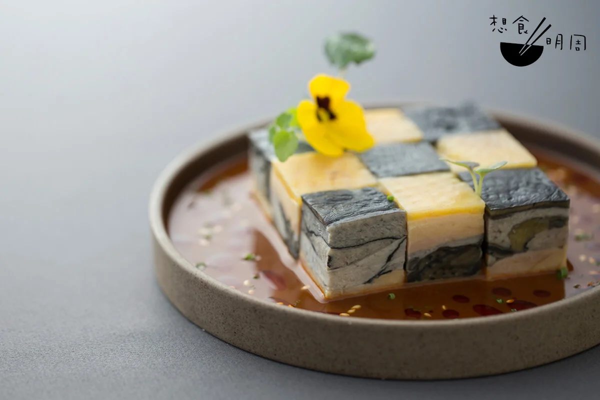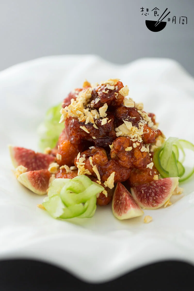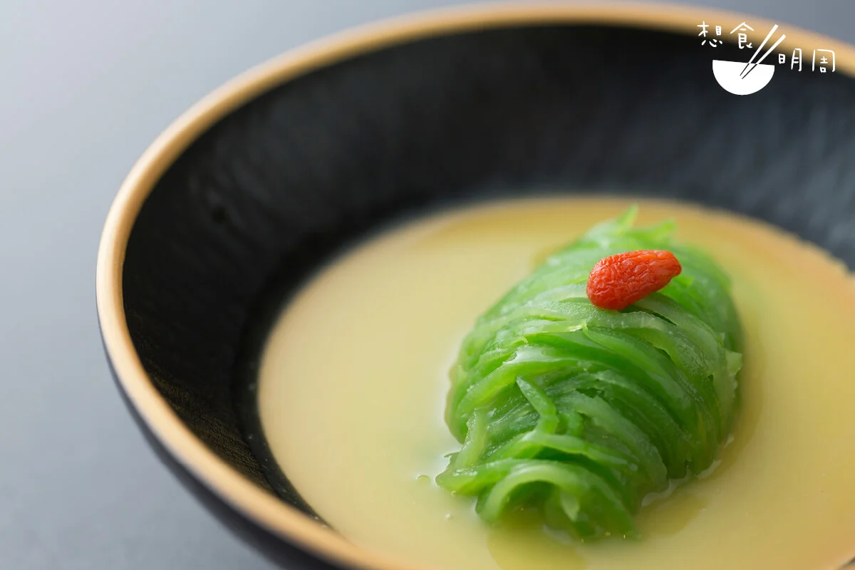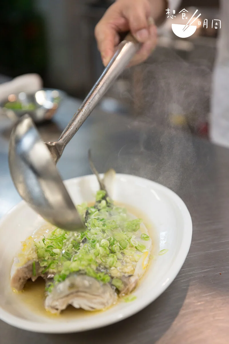 「馬友跟黃花一樣,一離水就會死;所以在街市買到的都只有冰鮮。」邵德龍師傅直言,冰鮮魚只要製法得宜,同樣可以煮出魚鮮之美。「有聽過鹹鮮吧?」那就是把魚用鹽花輕抹魚身,然後風爽一夜,鹽分不單止令魚更鮮味,也讓魚肉變得更富彈性;懂吃的蜑家普遍都會做。入行中菜四十年的邵德龍師傅,雖然生於四川,精於玩辣,但對於中式不同菜系亦喜以鑽研。「這鹹鮮已帶有鹽味,廣東人用薑葱去蒸,其實已經好鮮。」不過,邵師傅思考靈活,認為花雕和雞油可以令這馬友更和味。「花雕雞油蒸魚蒸蟹蒸蝦,好多人都曉,但想魚蒸來味道更有層次感,我還加了一小匙的酒糟!」魚上密密的佈滿薑葱蓉,既清且鮮;也難怪,在馥郁的花雕香中,隱隱嘗到一絲帶甜香的酒味,悠韻很長,原來滋味是因為酒糟作引。