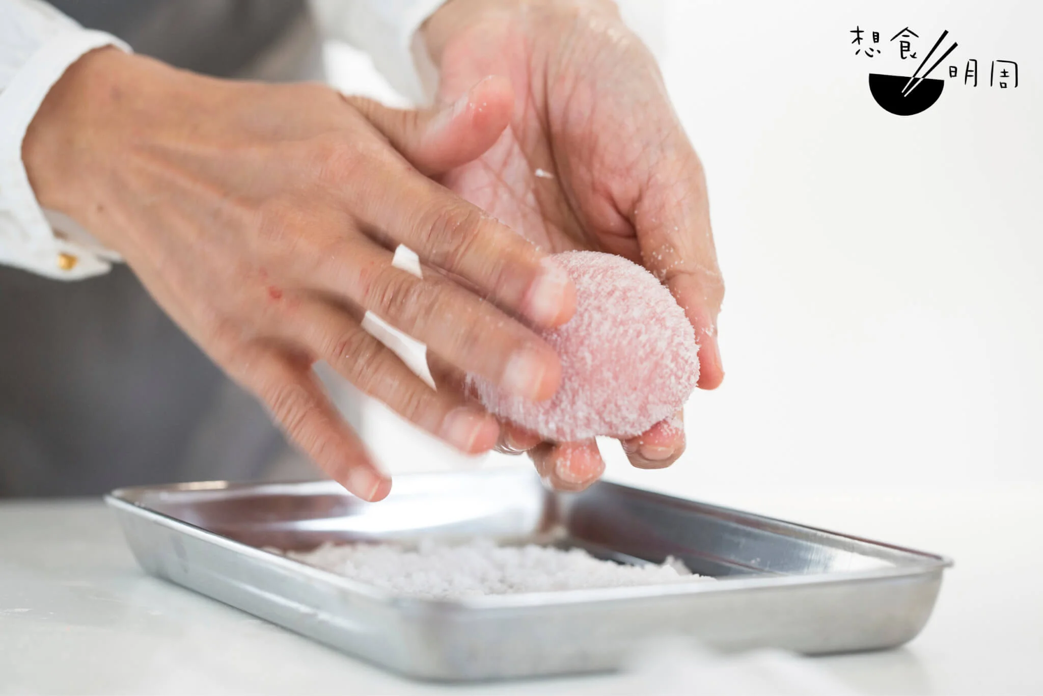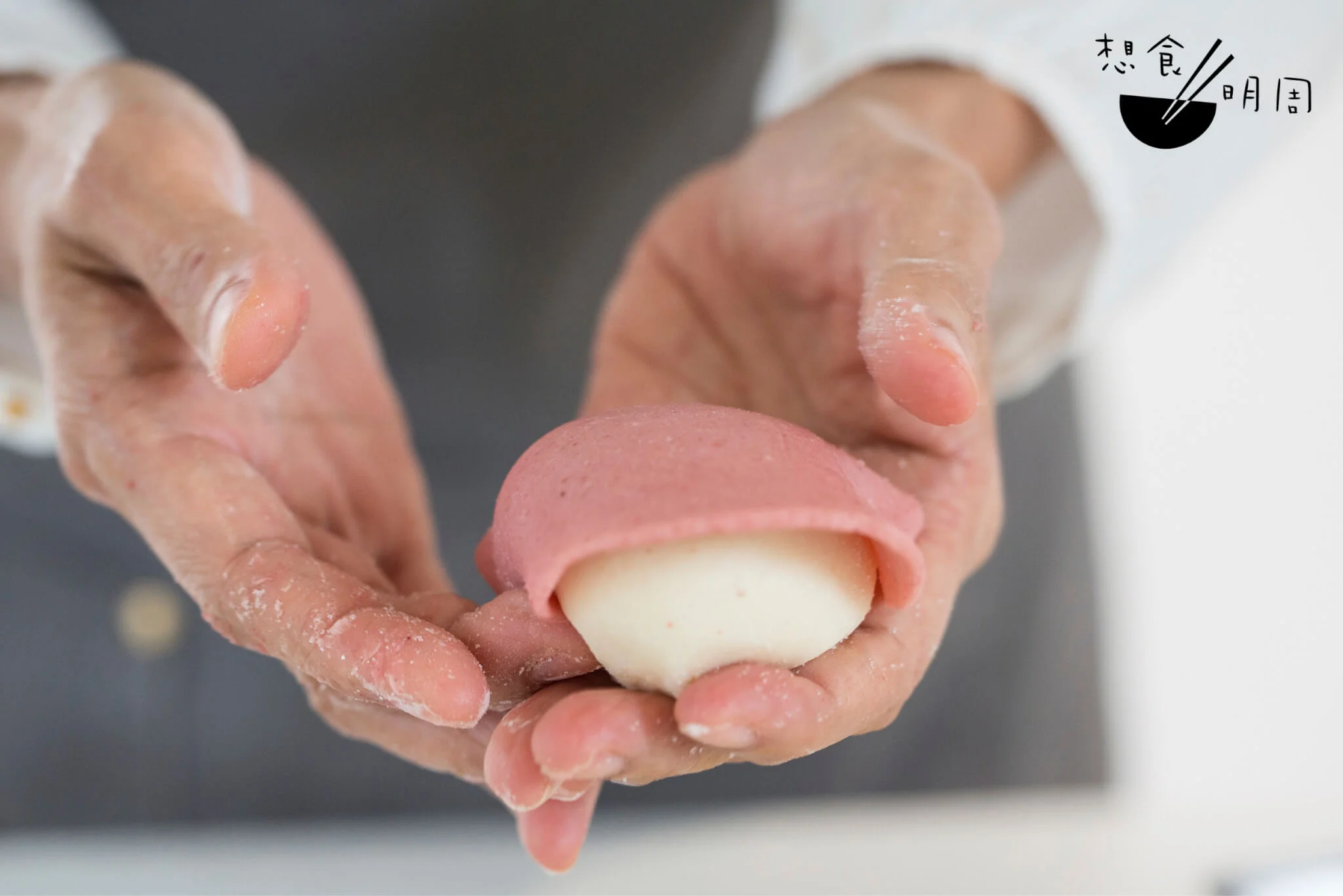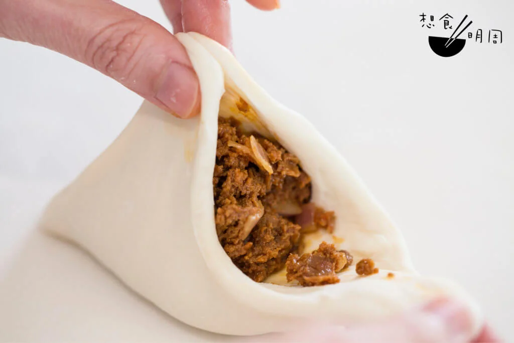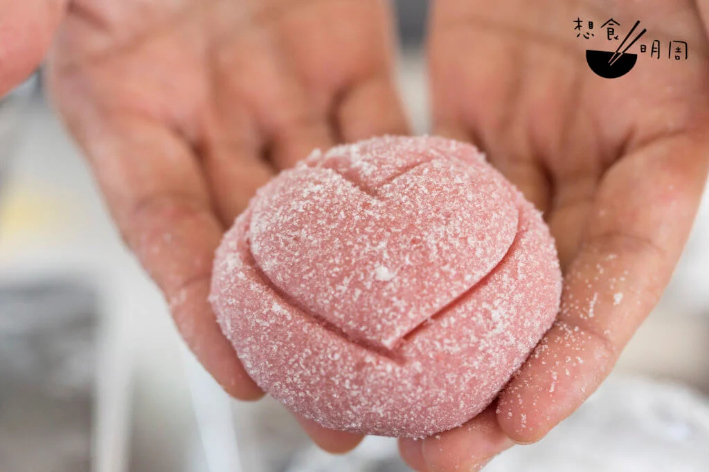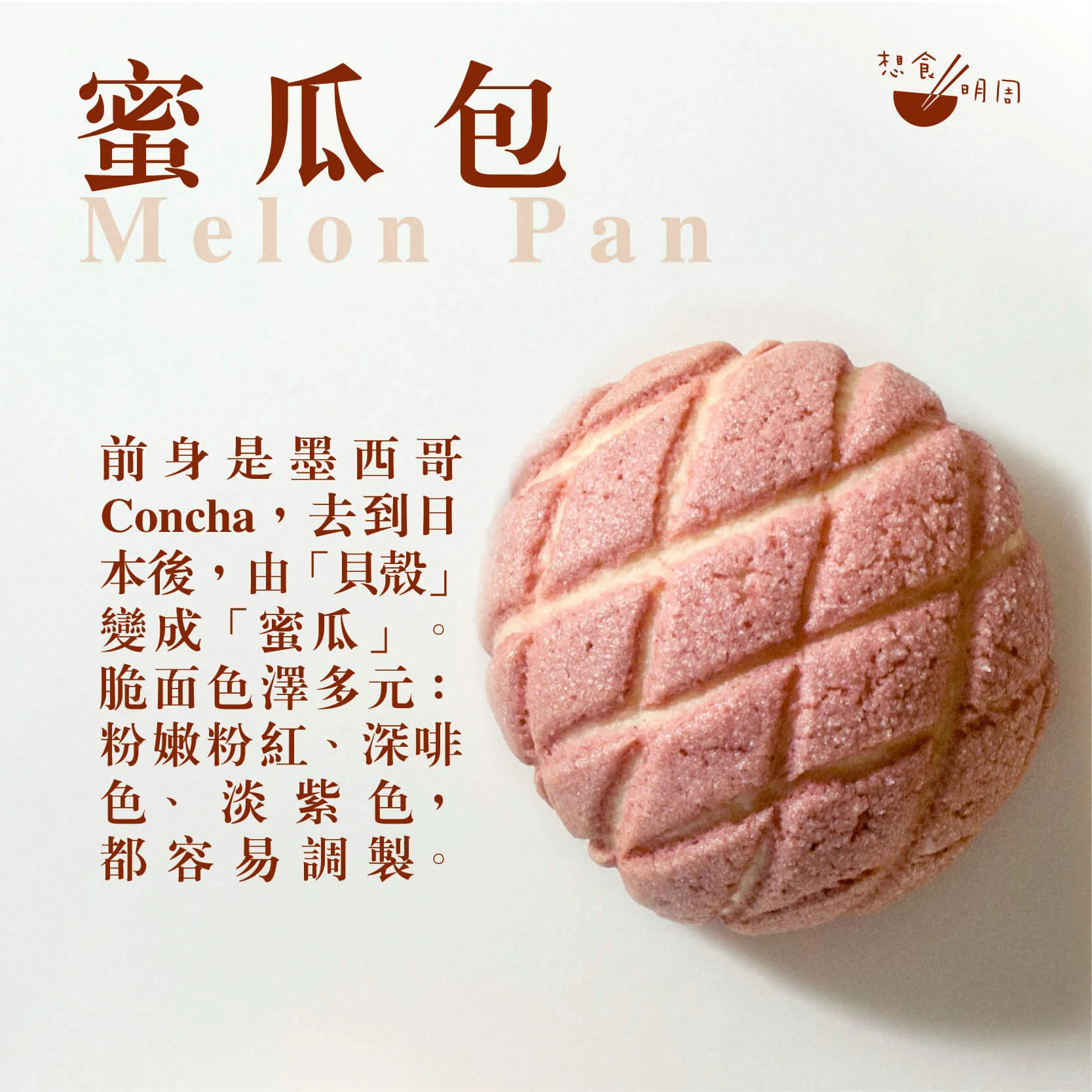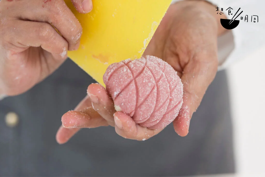 蜜瓜包同樣是先搓好包體,再在面層放一 層麵皮再烤焗。製作工序與菠蘿包相近,但蜜瓜包所採用的卻是「曲奇皮」,以牛油、麵粉、 鷹粟粉及奶搓製而成,烤焗前會蘸上糖粒,焗起後賣相會更漂亮,成品則呈硬脆口感。一如「前世」的Concha,面層坑紋都是人手利用刮板刻印𠝹劃,墨西哥人愛畫上波浪紋形成貝 殼,日本人就選擇交錯畫出菱格紋。開班教授製作蜜瓜包多年的Ginny笑言,由於坑紋都是由人手加工而成,學生有時會發揮奇思繆想,「試過畫心型或是英文字母」。