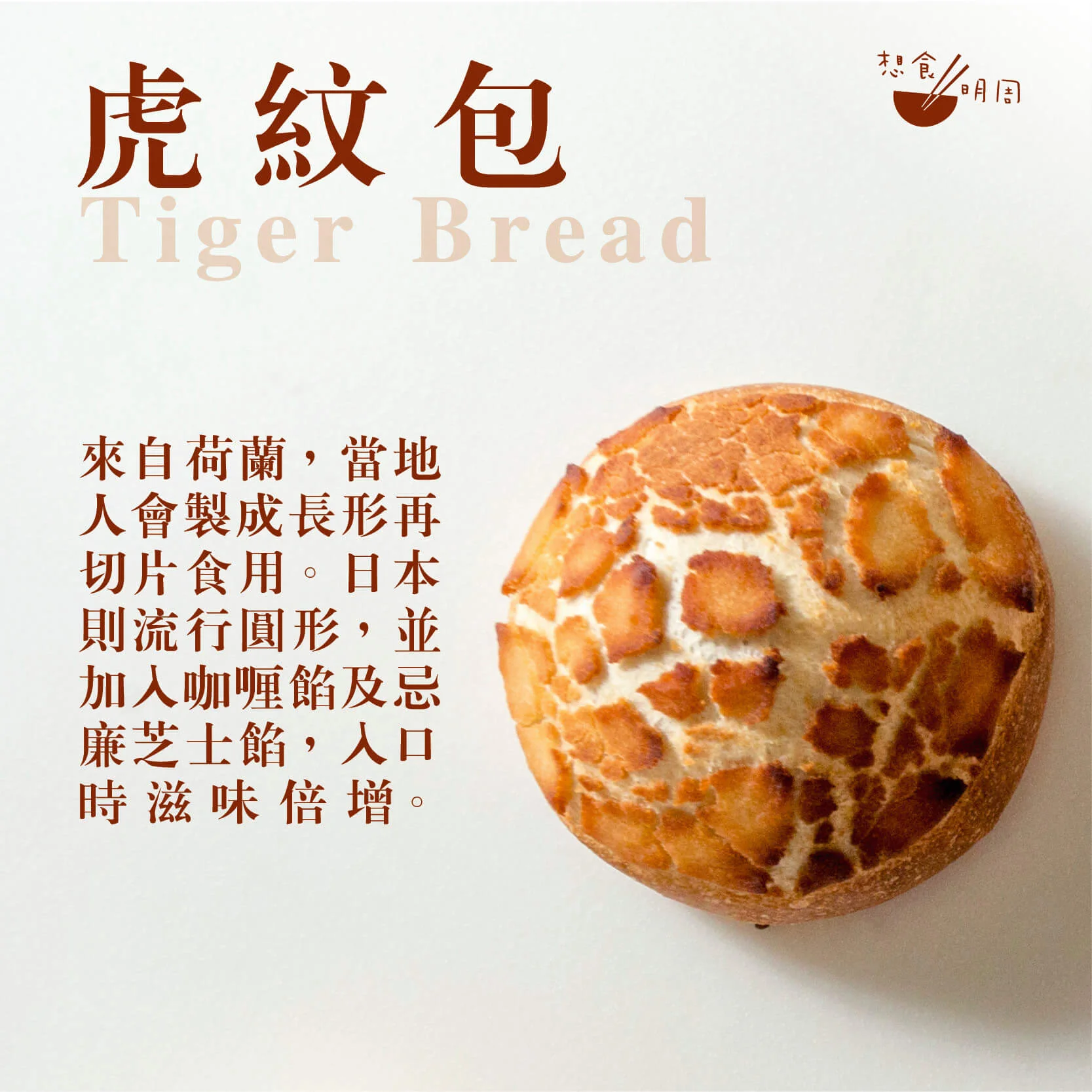 小時候,外婆每次從街市買餸回來,都會順道從麵包店買幾個包,有時候是提子丹麥條、雞尾包。有時則是菠蘿包, 剛出爐,回到家仍是暖烘烘的。那時總是好奇,菠蘿包表面的金黃裂紋是怎樣產生的?怎麼每次都不太相同、獨一無二?還有其他麵包也是這樣凹凸不平的嗎?後來,見識廣博了,才知道同樣披着脆裂坑紋的,還有 「虎紋」和「蜜瓜」等,流行於不同國度的麵包界。