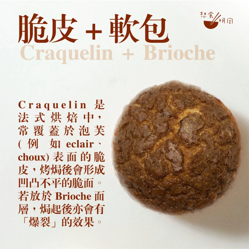 Greg分享說,他的「菠蘿包」其實是保留了軟包與脆皮的靈魂,卻換上法式的技法。「包體是特級初榨橄欖油Brioche,包面的脆皮則用法式糕餅之中的Craquelin製成。」Craquelin其實是一種常用於覆蓋在泡芙(例如eclair、choux)之上的脆皮,以牛油、糖、麵粉組成,烤焗後形成凹凸不平的脆面。以蘋果作內餡的一款,Greg就覆蓋上由錫蘭肉桂及Muscovado Sugar(未精製甘蔗糖)調製的Craquelin脆皮,呈深啡色。至於以雲呢拿及鹹蛋作餡的一款,面皮加入了鹹蛋黃製作,雖然呈凹凸表面,但裂紋深度相對較淺,酥脆口感亦與港式菠蘿包的不盡相同,各有各精彩。