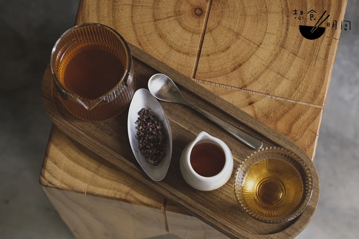 可可果肉、可可果衣、可可豆等原材料,現時主要從台灣屏東的「福灣巧克力」,以及泰國Chantabun的「Kad Kokoa」直接入貨。不妨由淺入深,先試試單品熱或凍朱古力,然後來點別處難覓的款式,如冷泡可可茶、虹吸可可茶等。後者頗得我心,先是看她即場把可可粒放在咖啡虹吸壺中沖煮,已覺新奇;把茶倒進小杯,一陣深濃的可可香竄進鼻,但嘴巴嘗到的卻是如山竹、荔枝一類的熱帶水果味道,叫人嘖嘖稱奇。