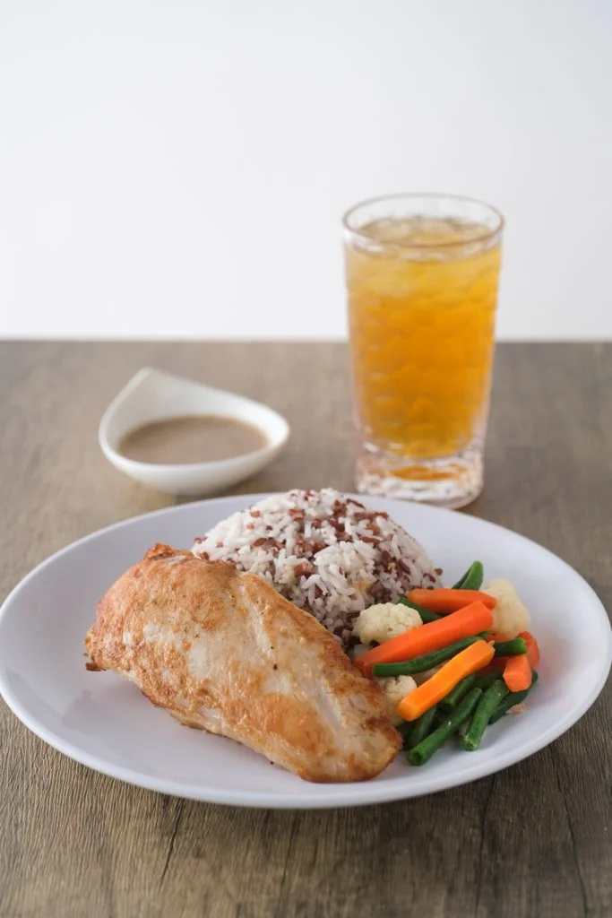 食用健身餐也需注重營養均衡,尤其在增肌飲食中,除了要吸收蛋白質,碳水化合物也不可缺少,因為醣類容易被身體消化吸收,亦會幫助增進運動表現及刺激胰島素分泌,是肌肉合成的重要步驟。「食得夠GYM」套餐的主菜是雞胸肉,搭配紅米飯、多種蔬菜和無糖凍綠茶。而紅米飯富含膳食纖維,抗氧化物和礦物質,增加碳水化合物之餘也可促進腸道健康,可見大快活廚師團隊在設計菜式時都是經過精心的配搭計算;每星期更推出不同醬汁,例如蕃茄芹菜汁、蘑菇汁、南瓜淮山汁等,風味多變化,不怕味覺厭倦!