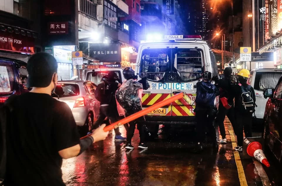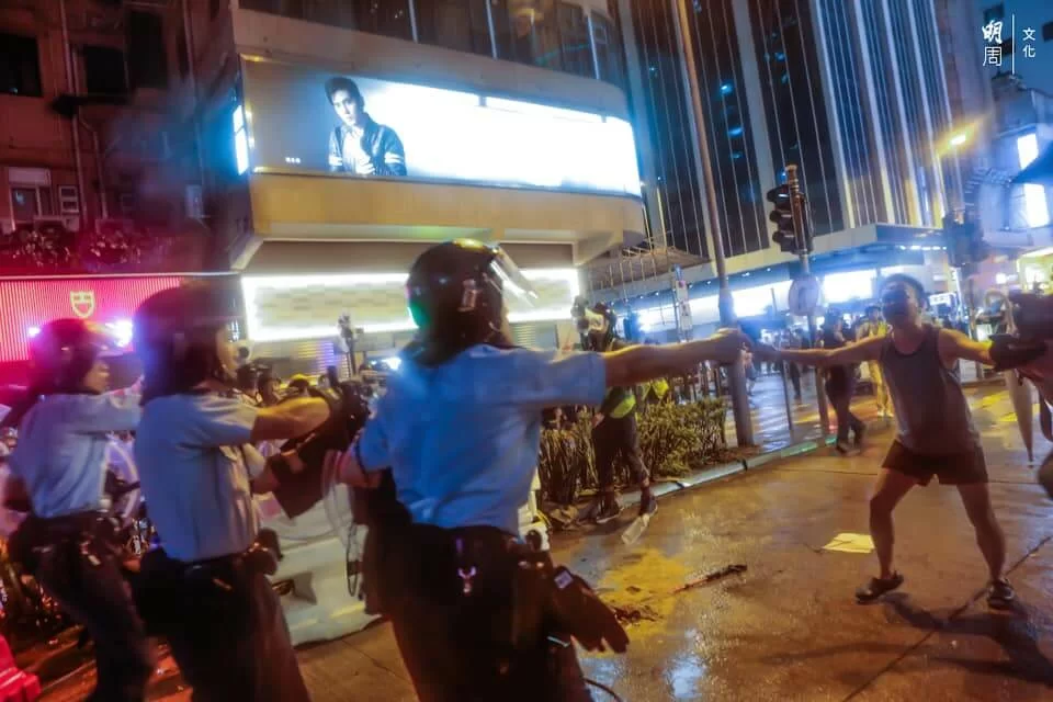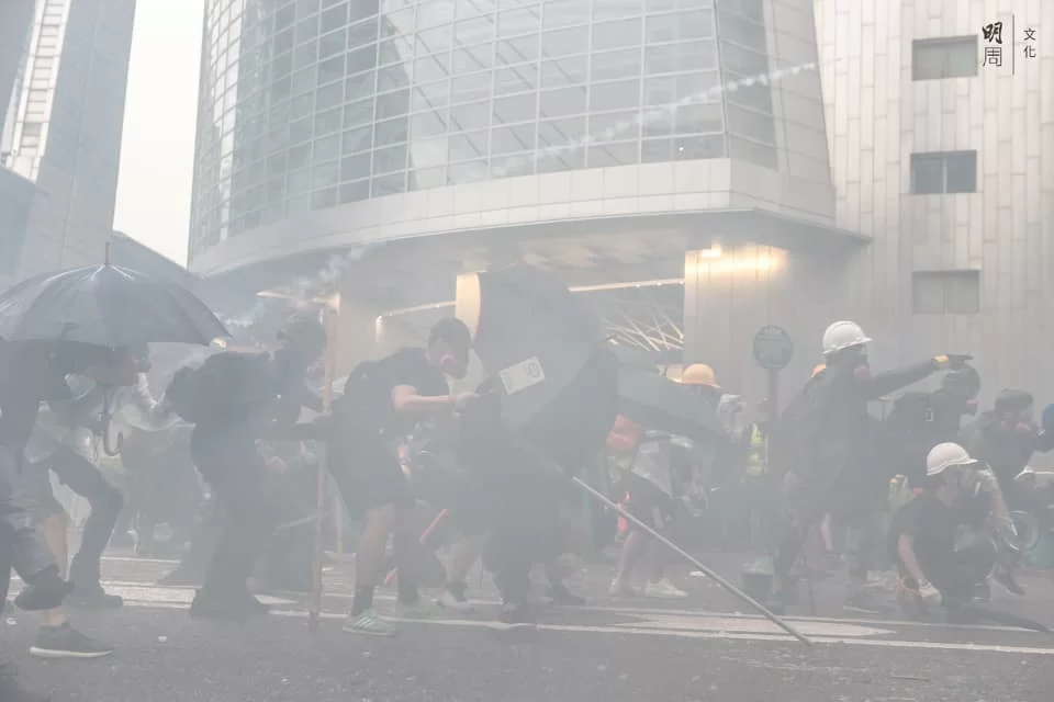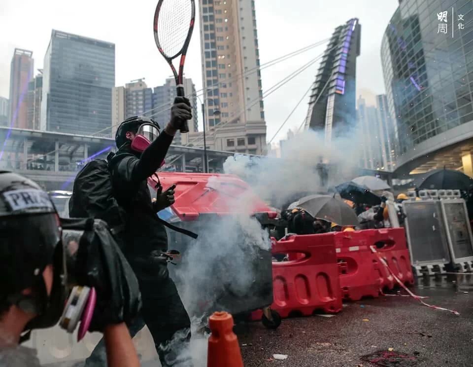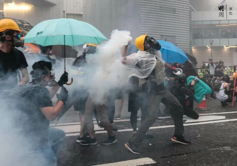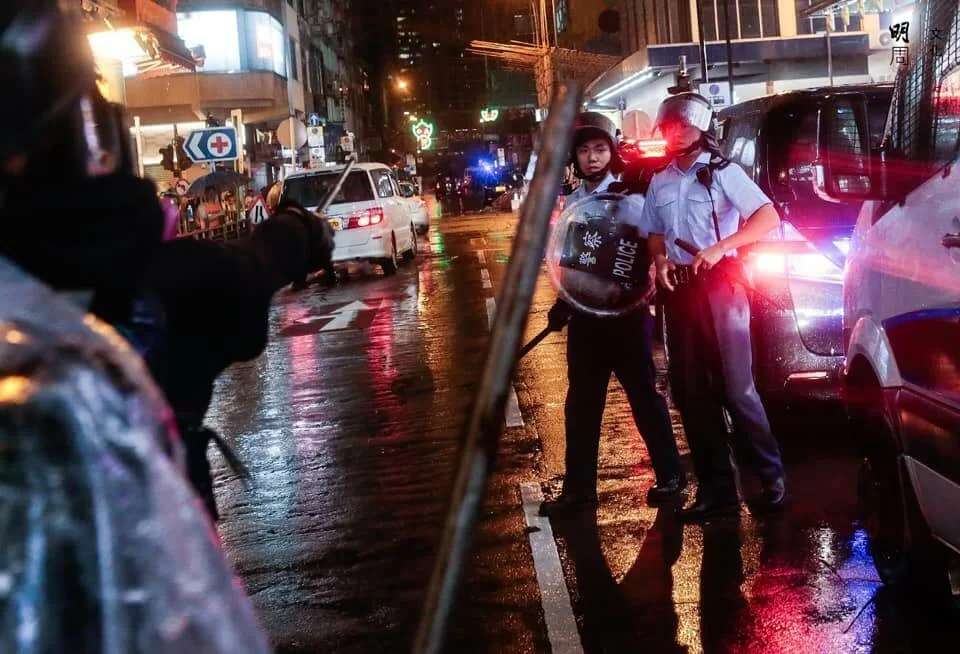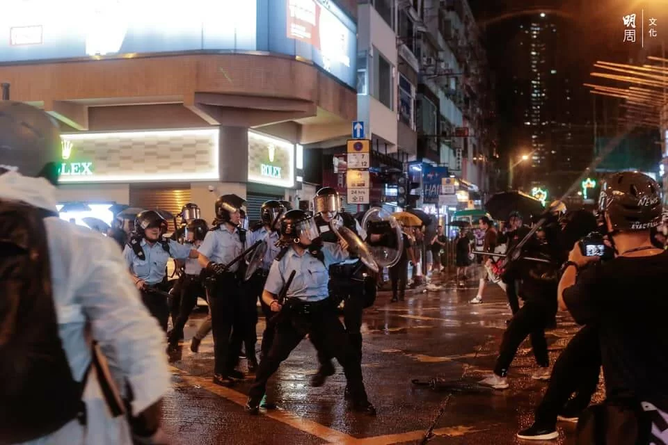 警方與示威者持續對峙,楊屋道彌漫催淚煙,有示威者曾嘗試以網球拍將催淚彈擊回,隨後示威者退至沙咀道,再設路障。
