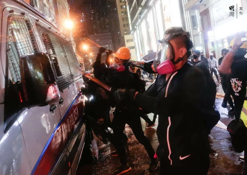 一輛警車駛過二坡坊路段,有示威者以拆下的招牌鐵通敲裂警車玻璃,然後離去。