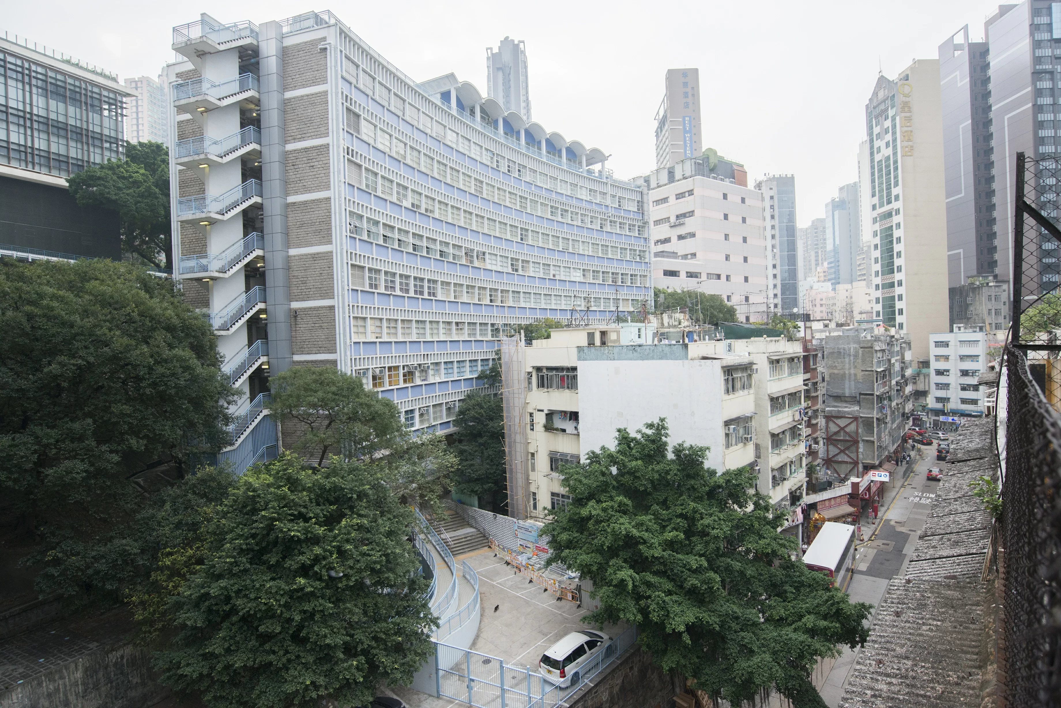 上面是西營盤賽馬會分科診所,下面是民居,皇后大道西仍保留殖民規劃風景。
