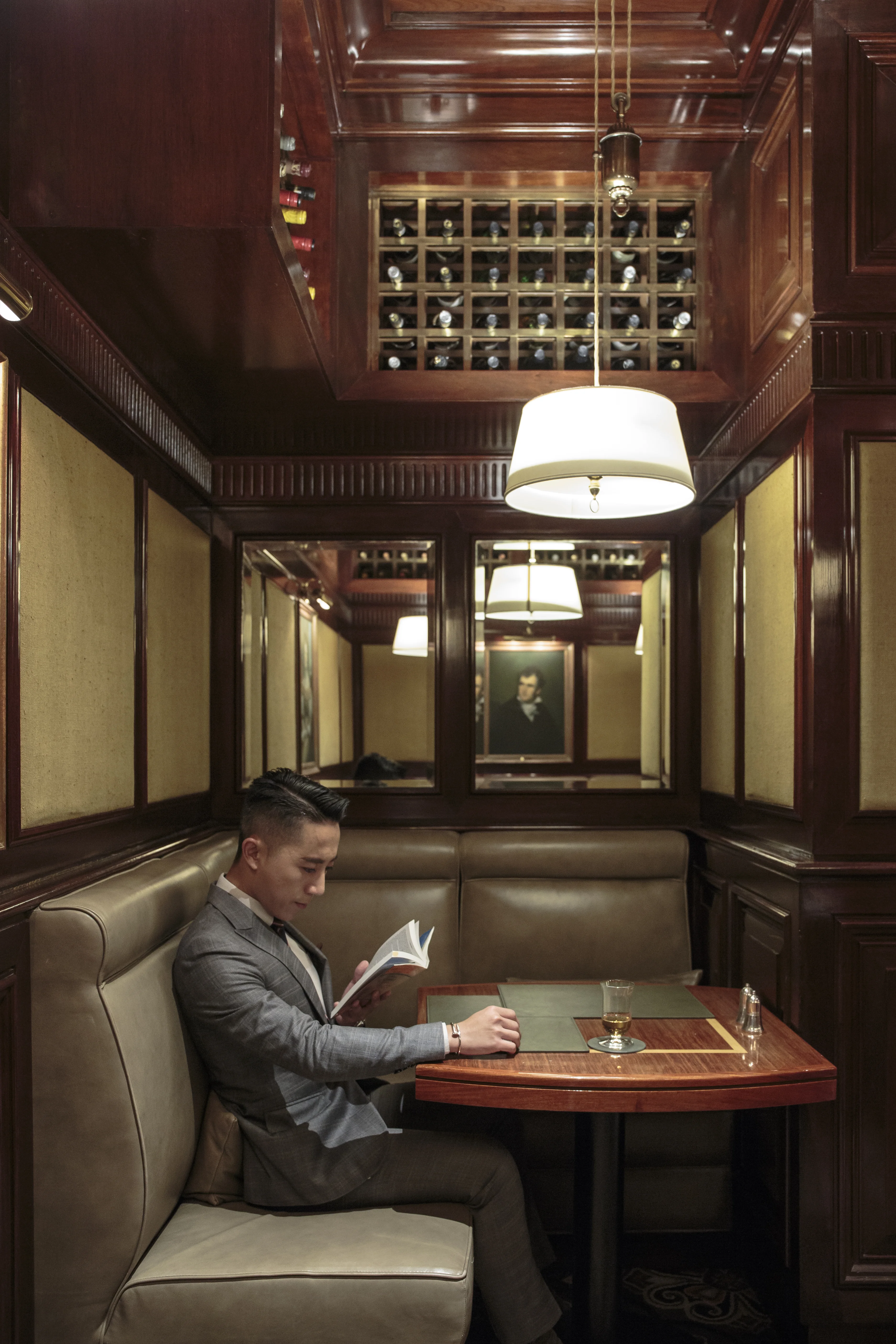 而在這間英國紳士會所氛圍酒吧位於酒店隱蔽的位置,那個神秘的卡位更是隱蔽中的隱蔽,一個絕無僅有的私空間。好像停留在1960年代,紅木餐桌,銅製酒架,銀杯, 喝完威士忌,抬頭就是英國藝術家George Chinnery的複製藝術作品。大教堂的庭院大樹下,在小食亭一角坐下來,只想和樹影一起沉思,不知今夕何夕。