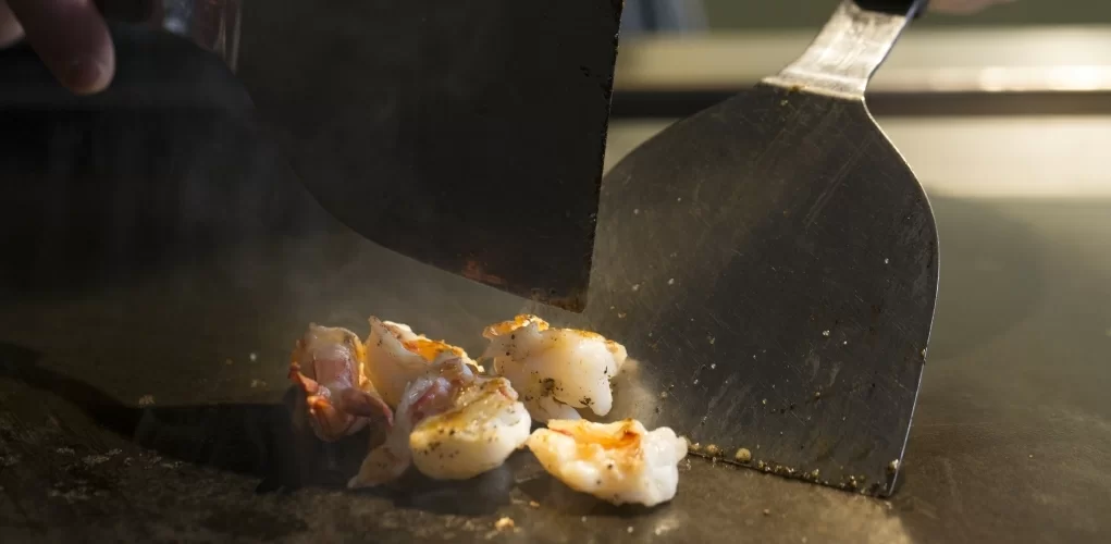 樂師傅是S2鐵板燒的老闆兼大廚,看他在鐵板燒前磨刀霍霍、手起刀落的表演,每一下都深藏功力,功架扎實,便知他經驗非常豐富。是的,他過去曾在松菱、水車屋、有馬等知名的日本料理店工作,之前也在創業,在中環小巷開設S2 Kitchen,因為把海膽菜式做得出神入化,引來一片讚賞,這次他再下一城,以鐵板燒作主打,繼續在爐板上大膽炮製海膽菜式。「海膽伴以牛油在鐵板上煮到融為一體,直到變成流沙質感,再淋到大蝦上。」那股鮮濃的香氣,讓人急不及待想把那海膽大蝦送到嘴裏去。