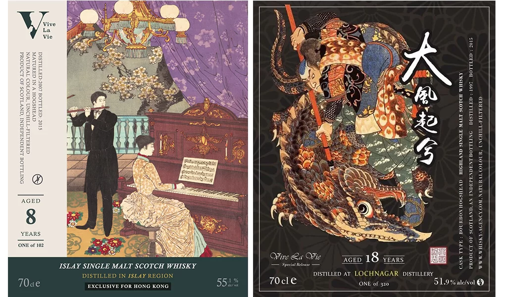 「五、六年前當我在銀行做貸款部經理,壓力非常大,當時太太的表姐夫由英國讀書回來,介紹我飲單一麥芽,就此停不了。我發現原來單一麥芽讓我可以紓壓,同時又保持清醒頭腦思考,加上香氣豐富,餘韻可以好複雜,當時我創辦了『香港威士忌同好協會』跟酒友一同分享、研究威士忌。一有假期,我就飛去日本、台灣,一邊參觀酒廠一邊品試,雖然品試量少,但每日會試上八至十款,兩三年間我試了二、三千枝。有了同好會後,每年都會和會友每人帶一支去台灣跟當地另一個同好會『一支會』一齊分享品試,每次要試上成千枝。我專買一些古靈精怪,少見的,像Springbank,全球只有90枝,又或者1967年的Macallan,總之一有機會就試就買來收藏,或跟酒友分享。我計過,我的收藏差不多相當於一層樓的首期。就在考慮辭工之時,我想:反正也是要買,不如跟酒友一齊夾錢包兩桶更化算,一問之下,反應不錯,當中台灣朋友提到既然包桶回來也要入樽分給酒友,何不自己裝瓶將之發展成做一盤生意?於是便成立了Vive La Vie,第一個系列是『對酒當歌』,選的是2000年蒸餾2014年裝瓶的Glengoyne 19年,和1995年蒸餾2015年裝瓶的Glengarioch 19年,特地選用了以日本浮世繪風格的《三國》作為招紙設計,限量生產分別是308枝和220枝。」