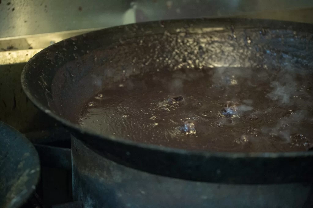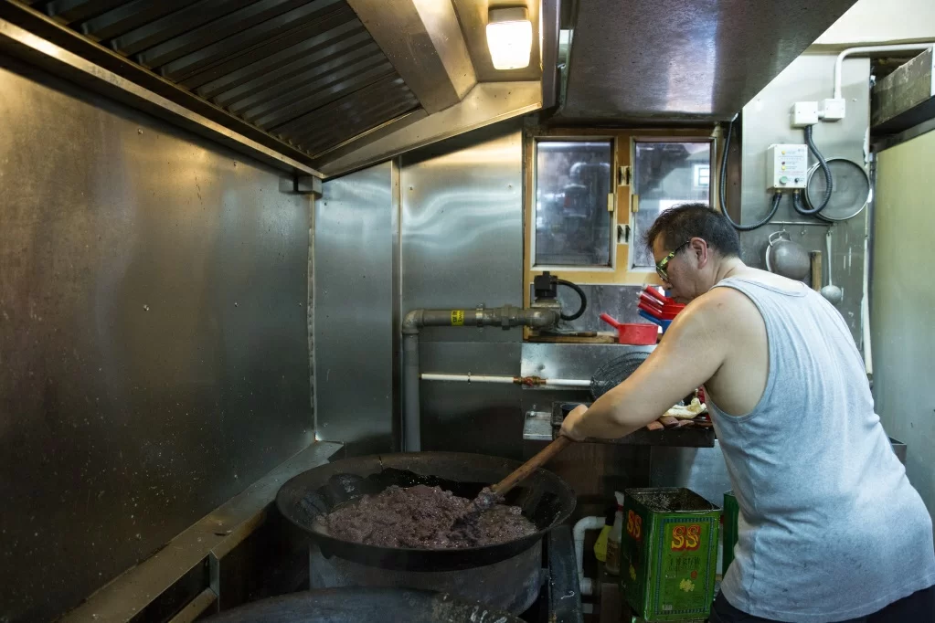 煮日本豆沙需要細心和觀察,傳統餅家沒有這等閒工夫,仗賴的是力氣和忍痛能力。日本豆沙溫婉柔情,中式豆沙卻桀驁不馴。他一次便炒三、四十斤豆沙,需要用自己特製的鋤頭柄大鏟才可炒得動。豆沙加入砂糖和花生油後非常容易黏鍋弄焦,「香味和焦苦味,客人吃得出來。」故拌炒時一秒不能停下,炒近一小時,汗如雨下,肩膀痠痛。「有時想抹汗,飲啖水,便換下人,也可以不用別人接力。」不禁流露自信神色。用文火熬煮的豆沙像火山般猛地冒泡,他形容是「火山爆發」。此時只能單手遠距離炒,用鏟背將豆沙推炒,「金晴火眼地看着,要識閃開。面啊、手腳心口無數次彈到。」只見他胸膛和手臂上道道疤痕,都是「火山岩漿」四濺的印記。現在的他變聰明了,會在爐邊加塊擋板。