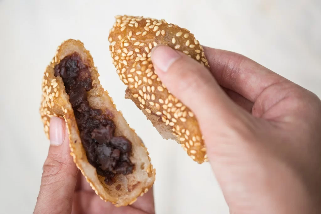 傳統中式糕餅用的都是豆沙餡,只是大多數老餅家都不炒豆沙了,坤記是少數仍在堅持的餅店。老闆之一的傅永康炒了四十年豆沙,輕描淡寫:「以前在天棚已經炒豆沙了。沒有機器,紅豆都是石磨,逐點加水磨,半小時才磨到一袋。」石磨豆沙矜貴,都用在糯米茶果上。也有用較廉價的竹豆豆沙,「我爸以前會把竹豆搓到煎堆中,不似津紅般甘香,炸了不覺。」現在他有生鐵製的磨米機幫忙,將天津紅豆稍為浸軟,即可以打磨成漿,再像做米漿般用大石頭迫出水分就可以炒了。
