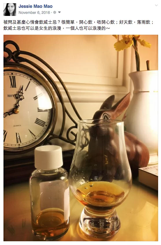坊間一般認為,鍾情單一麥芽是很陽剛性的選擇,然而Jessie這位畫家卻因為單一麥芽而更能表現女性獨有的感性:「對我來說,每次品試時,我不像男孩子那樣寫tasting note,我只是盡情投入當時那杯酒帶給我的意境,如果那次品試不能讓我感到意境,或跟過去回憶連繫不上,對我來說,對品試沒記憶即代表那威士忌無性格──女孩子享受的,是飲酒當下的感覺能跟自己生活產生共鳴和聯繫,可以令你找回那些以為已經早已被自己遺忘的時刻,那種失而復得的珍貴,令到那杯威士忌和當下結合成日後的回憶。就好像我飲到一枝有香口膠味的威士忌時,馬上記起的是一個小學時下午小息,一時間,當時的聲音和甚至皮膚上的感覺都記得清楚;有時由口裏傳來的花香,或泥煤味,卻會令我靈光一閃,從中創作出一個故事,或帶出一種感覺,讓我很想畫下來。」