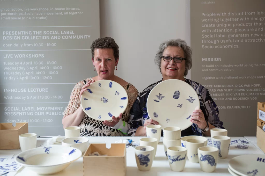 這裏自成一國,來自荷蘭的Marina van Overdijk和Ans Kantelberg Lehmler專注地將藍白色公仔紙放進水碗浸濕、黏貼在陶器上、撫平紋理,每個陶器都訴說着她們的故事。十多個精神病人與殘疾人士利用二百五十個插畫貼紙,道出自己的故事,坐着輪椅哭泣的女孩、去世的愛狗、自由的翅膀……她們都曾經歷至親離世,而患上精神病。「Ans的丈夫和兒子同樣很早離開,她每天都食很多藥控制情緒,但她來到米蘭心情好愉快,今日是她第一次不用食藥。」荷蘭社企Social Label創辦人Simone Kramer和Petra Janssen欣慰道。
