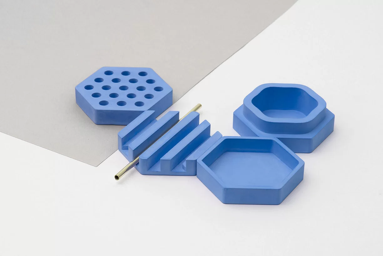 他推出的水泥蜂巢桌儲納組合,可以整齊地收納卡片、電子用品、便利貼、各類型的筆與植物。每件水泥家品都是用手工製作,並經過二十八天養護和手工打磨才得到細膩質感和均勻顏色。他最近甚至研發出藍色水泥,他視設計如實驗,下一份傑作又是什麼呢?