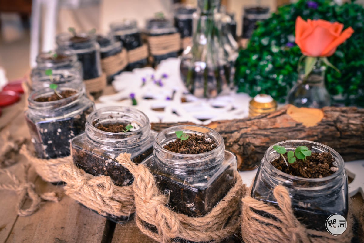 除了選擇低碳婚禮設計,Louis有時也會提醒客人,不妨把廚餘打包,捐予惜食堂等社企,轉贈有需要人士;參與「一翅都唔食」,支持無翅婚宴,並選擇永續海鮮;婚禮周邊也有事可做,她曾提議一位客人,找本地手作品牌「水木研社」設計喜帖,「水木妍社的主理人喜歡上山執落葉,會用蕉葉、咖啡渣等植物造紙,花上一星期烹煮、製作、風乾,每張紋理顏色都略有不同,真正獨一無二。」Louis說。回禮禮物方面也貫徹低碳原則,他們與粉嶺馬寶寶社區農場合作,購入一批香草苗作為新人回禮禮物,更用農場從社區回收的啤酒鋁罐盛載,支持本地農業。