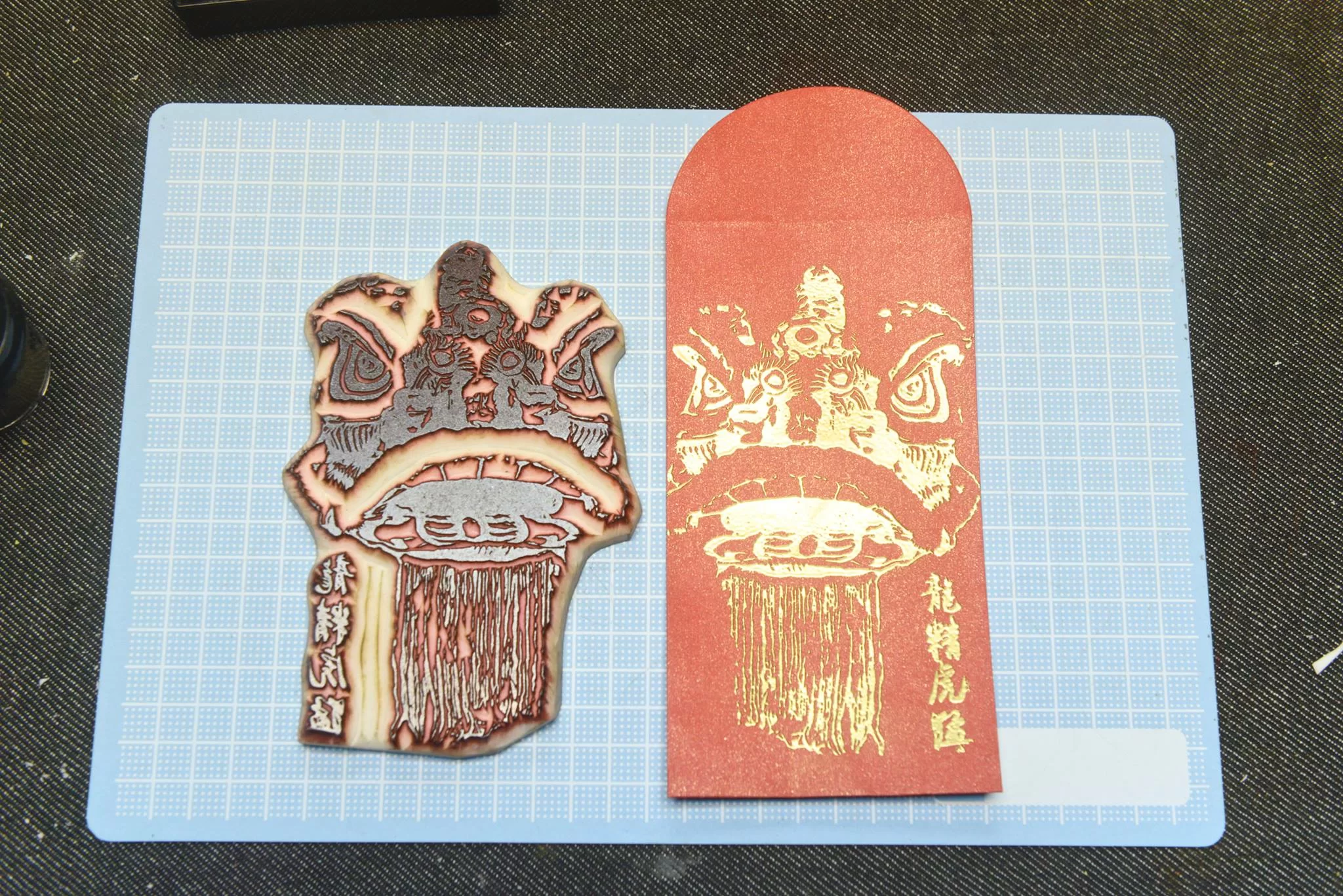 手作達人Jason則利用自己最擅長的橡皮印章製作利是封,設計圖案之後以手造印章逐張印製,再在利是封上倒上凸粉,添上金色的光澤並豐富質感。手工製作難免花時花力,但效果充滿懷舊的過年感覺。
