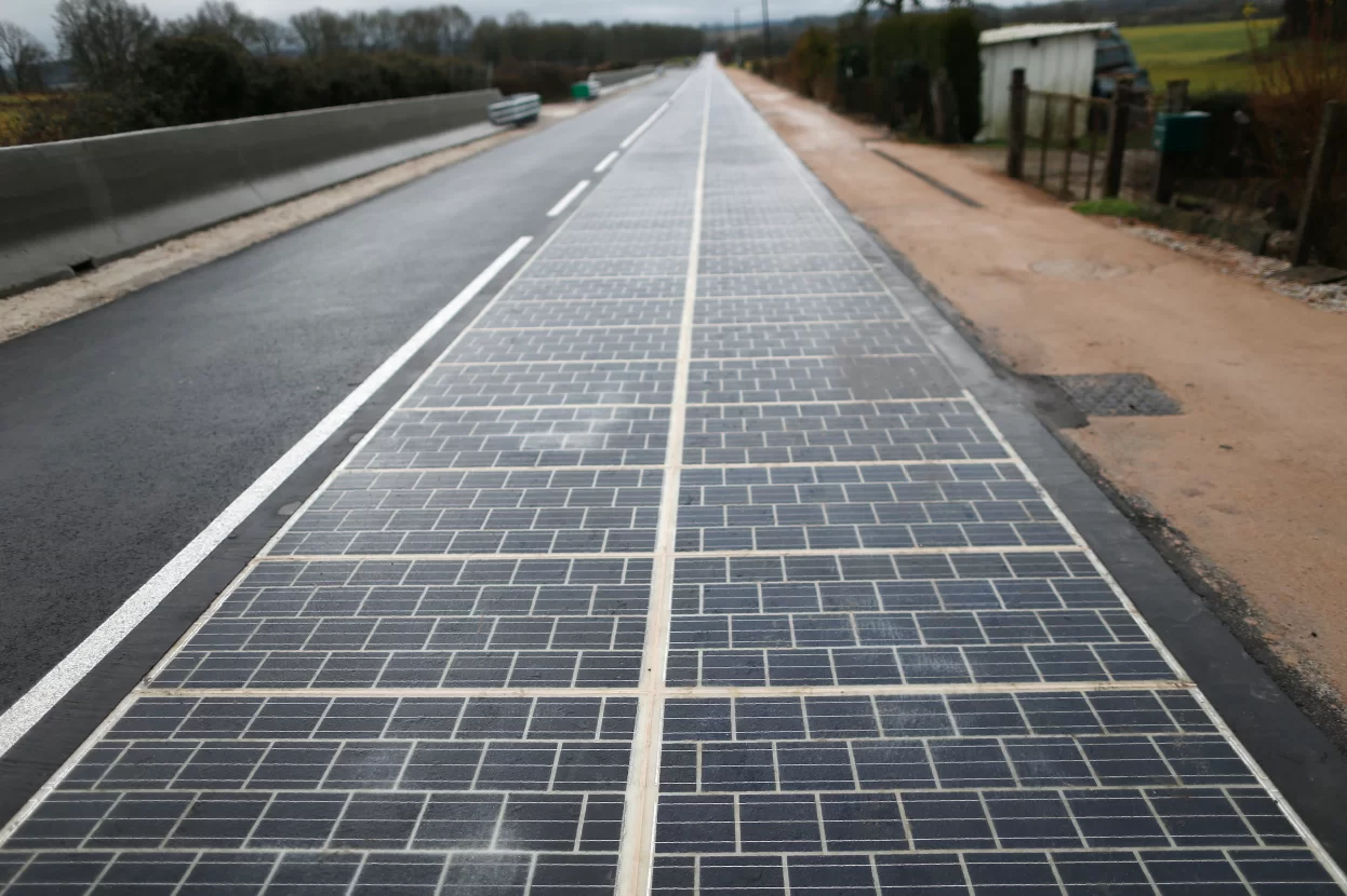 首條鋪設太陽能發電板的公路,位於法國諾曼第的一個名為Tourouvre-au-Perche的山區小鎮,該鎮居民只有3400人,原本寂寂無聞,因為這條特別的公路而一舉成名,吸引遊人及傳媒專程到訪,它在去年12月底正式開通,由法國政府與當地土木工程公司Colas合作興建,整條公路全長一公里,總共鋪設了2800平方米太陽能板,每日平均有二千架次車輛使用該公路,理論上每日可產生790千瓦時電量。