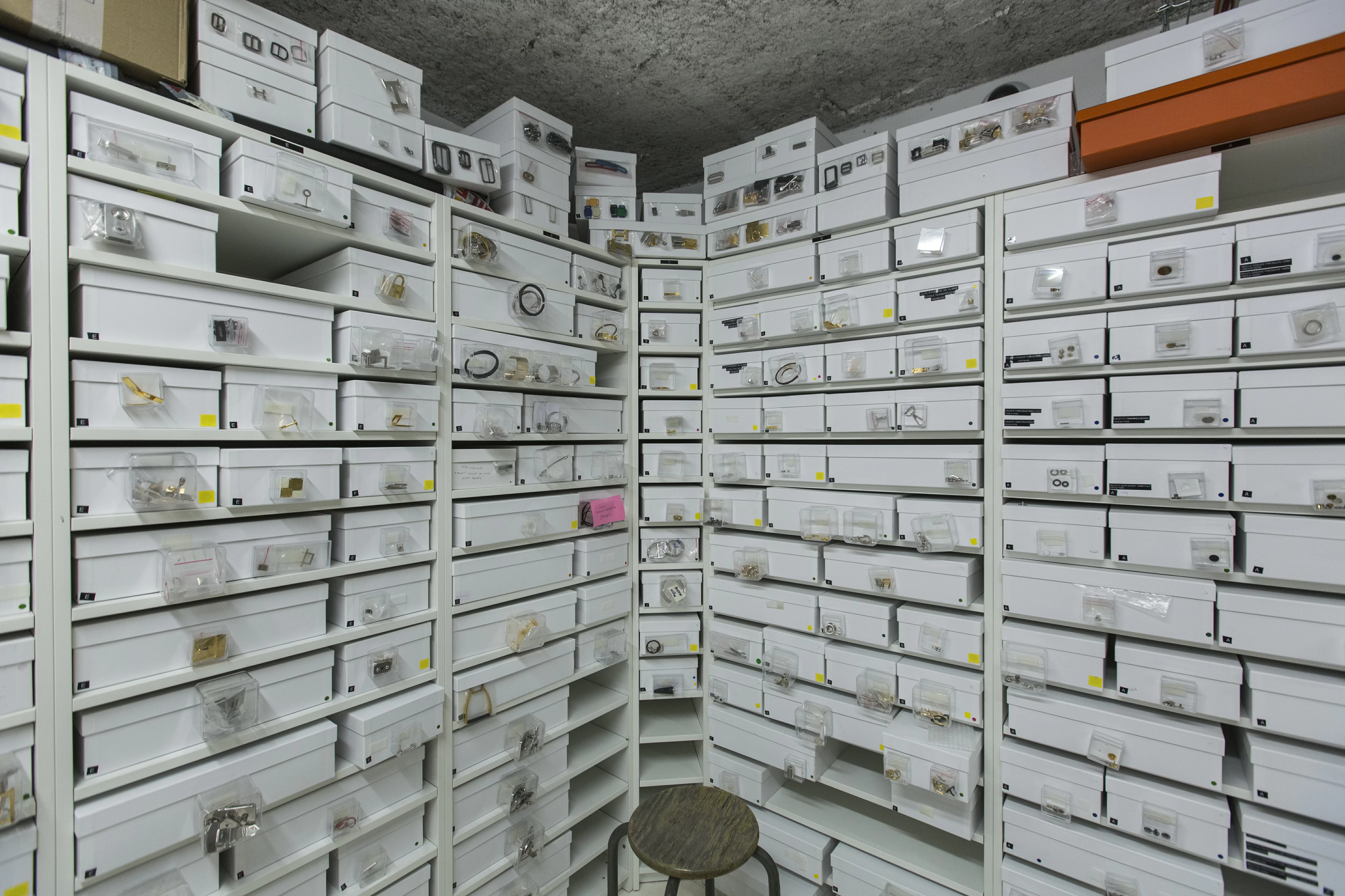 跟隨Godefroy走進工坊其中一個小房間,一邊放滿了一個個小抽屜,當中放了各式鈕扣零件等細碎物料,另一邊則是一個個透明的儲物櫃,正是設計師的靈感寶箱,由於工坊每隔一段時間就會從品牌內其他廠房搜集剩餘物料,所以每位設計師拿到的物料都不會一樣,很多時更要先到先得。由於工坊空間有限,所以每當其他部門的項目經理有剩餘物料,便會通知Petit h,由Godefroy判斷是否合用才收留,先經過他那關,合用的才被選進物料庫。