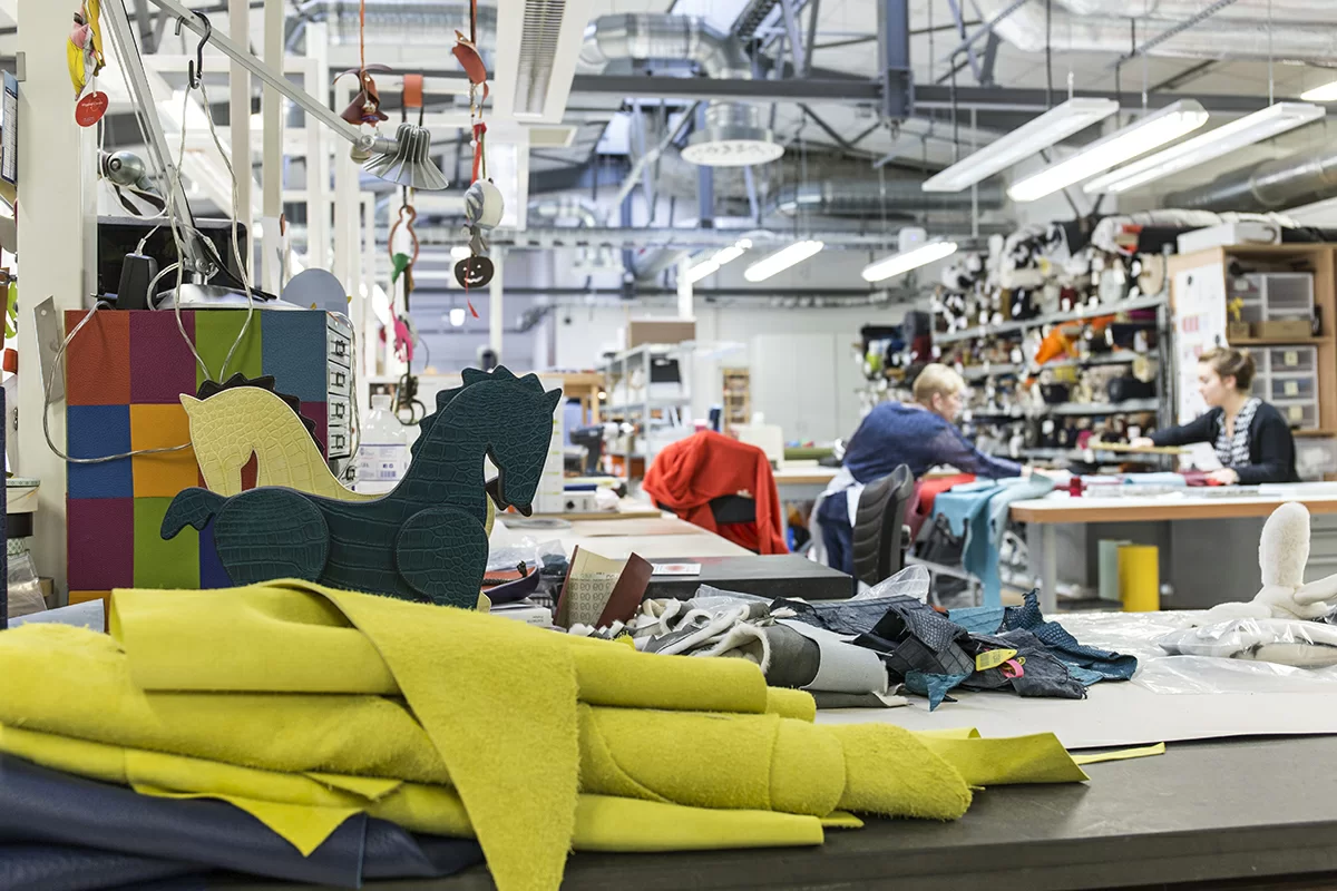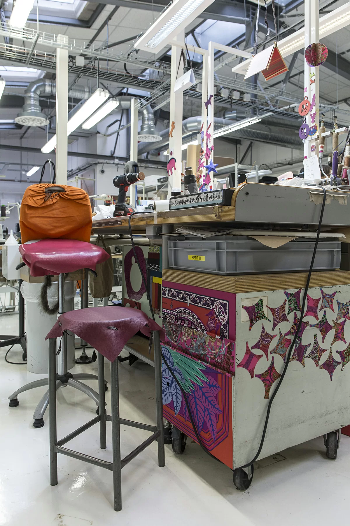 工坊佔地7000平方呎,擁有物料庫、生產中心和成品儲藏室。在以往,愛馬仕每個手袋都是由一位工匠親手製作,但在這兒,工匠間的交流非常緊密,工場沒有一條明顯的生產線,開放式的設計放了多張工作桌,八位工匠來來往往,在這裏,工匠不只是負責把產品製作出來,也會參與設計過程。「工匠們一大早便回來,他們各自桌上放的物料和半製成品都不一樣,總喜歡互相交流,這樣工作會更有靈感。」
