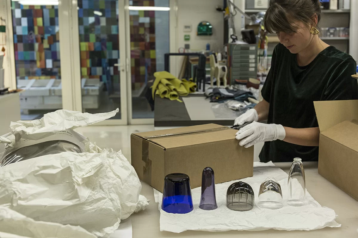 每次從愛馬仕其他部門運來的剩餘材料都不同,到訪當日見證一些水晶杯身送來,開箱一刻工匠們都雀躍地着攝影師快拍照。