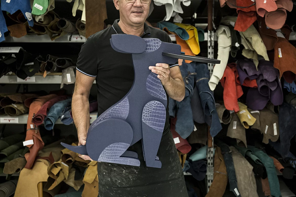 小狗造型茶几是Petit h產品,上面的皮料都是原本用來製作愛馬仕手袋的優質皮料,只是被裁了出來的部分。