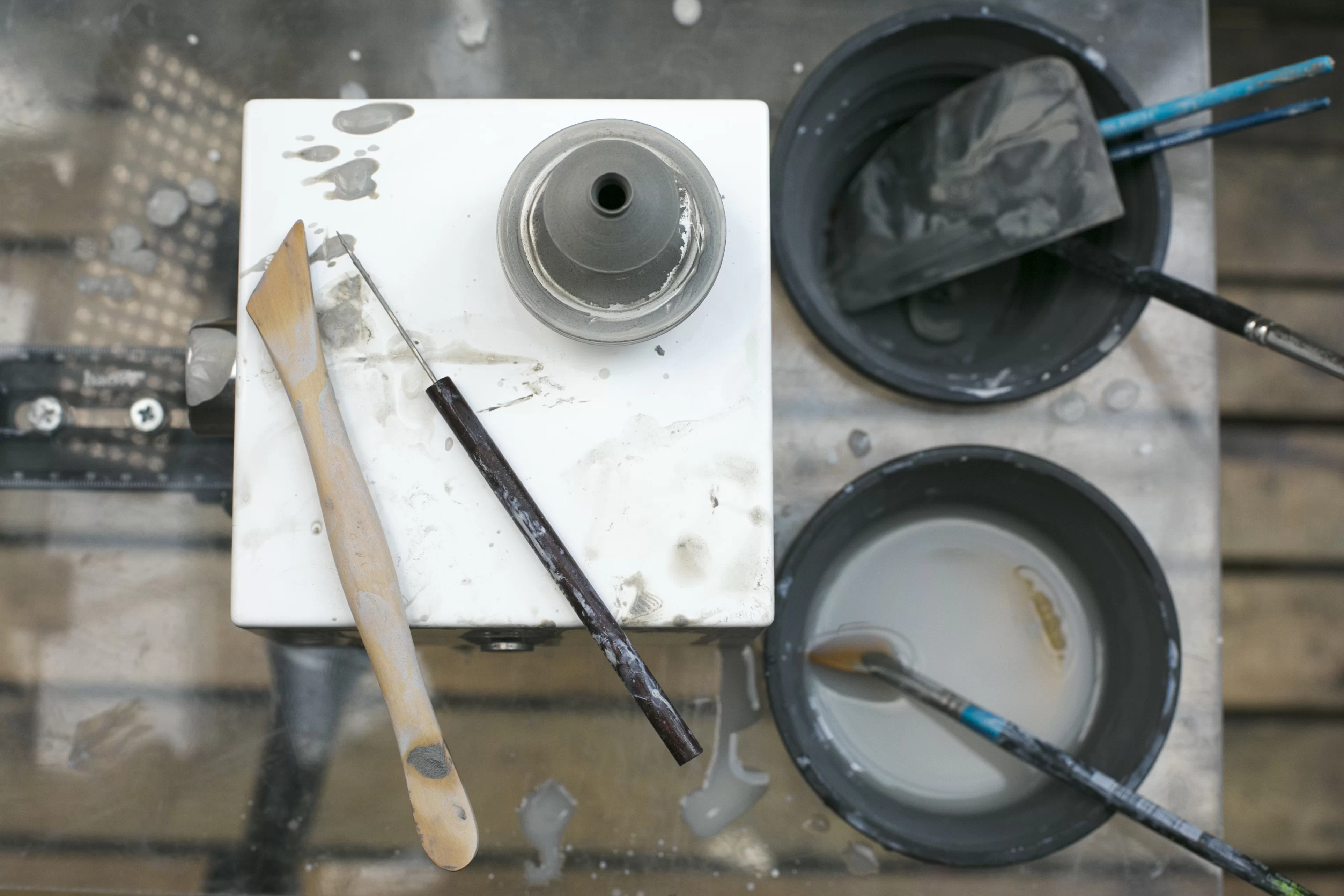 製作袖珍陶器的一大好處,在於工具也因而變得輕巧得多,只要有一片空地放置工作枱,無論何時何地都可以輕鬆創作。Jon把三腳架改裝成流動工作枱,在雲台上加設亞克力板,用來放拉坯機和水杯,就連手機腳架和LED燈也一應俱全。雖然在華盛頓有自己的工作室,但他更熱中於走到街上和郊外創作。「無論我去哪裏旅行,我都會把這些工具放入背包、帶着腳架同行。」
