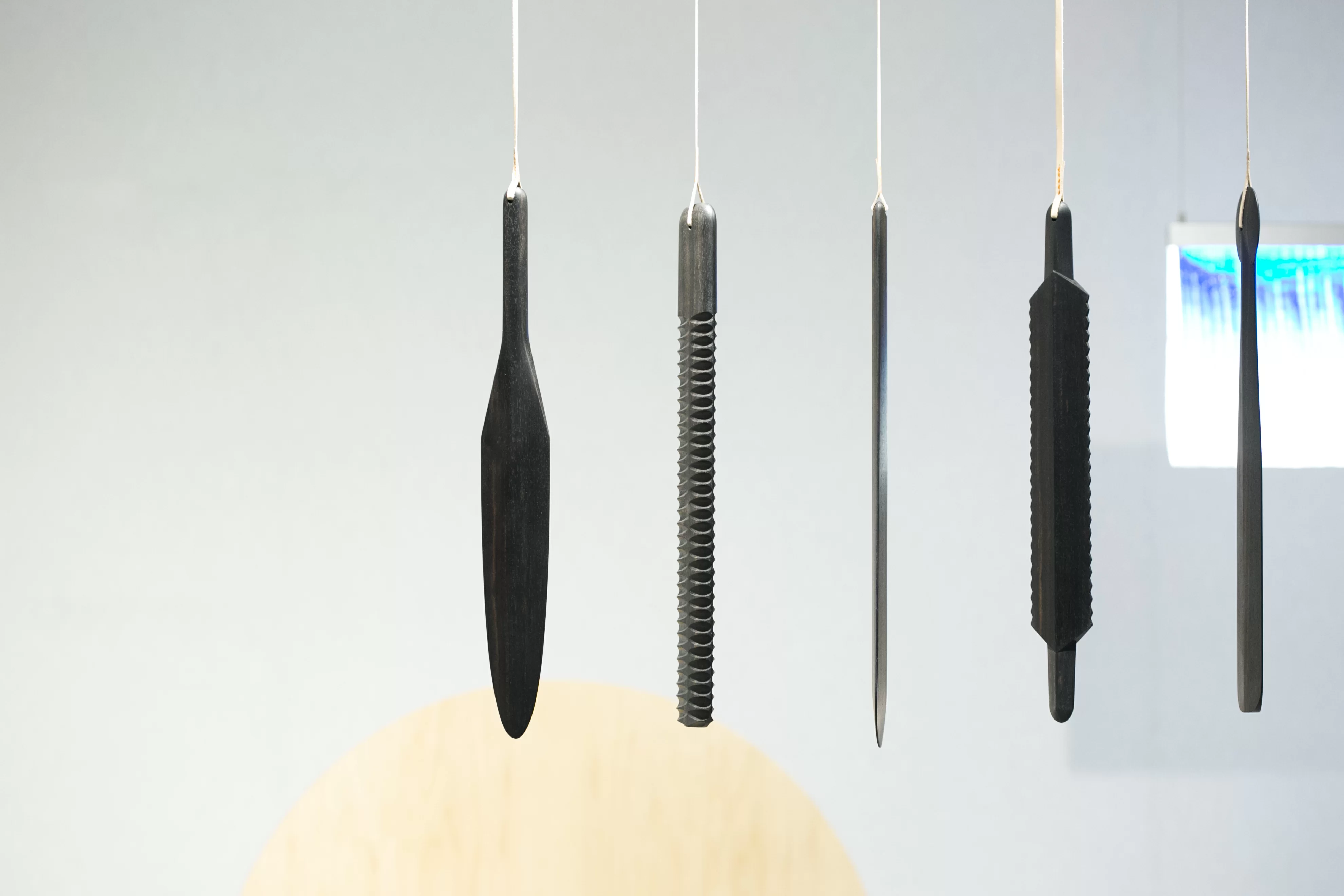產品設計師Pierre Charrié創作的產品很多都與聲音、氣味和動作有關,例如木屏風似的喇叭Surfaces Sonores,略帶弧度的大塊薄木板,作用如結他的共鳴箱,可以連接智能手機,發出重低音。不過最特別的是一組木製掛飾,「它其實是參考了古代一種名為吼板(Bullroarer)的樂器,據說已有數千年歷史,在非洲、澳洲亦找到其出土,以木或動物骨頭打磨而成,一端用繩索住,只要手執繩子打轉,便會發出低沉嗡嗡聲嚇走動物。」